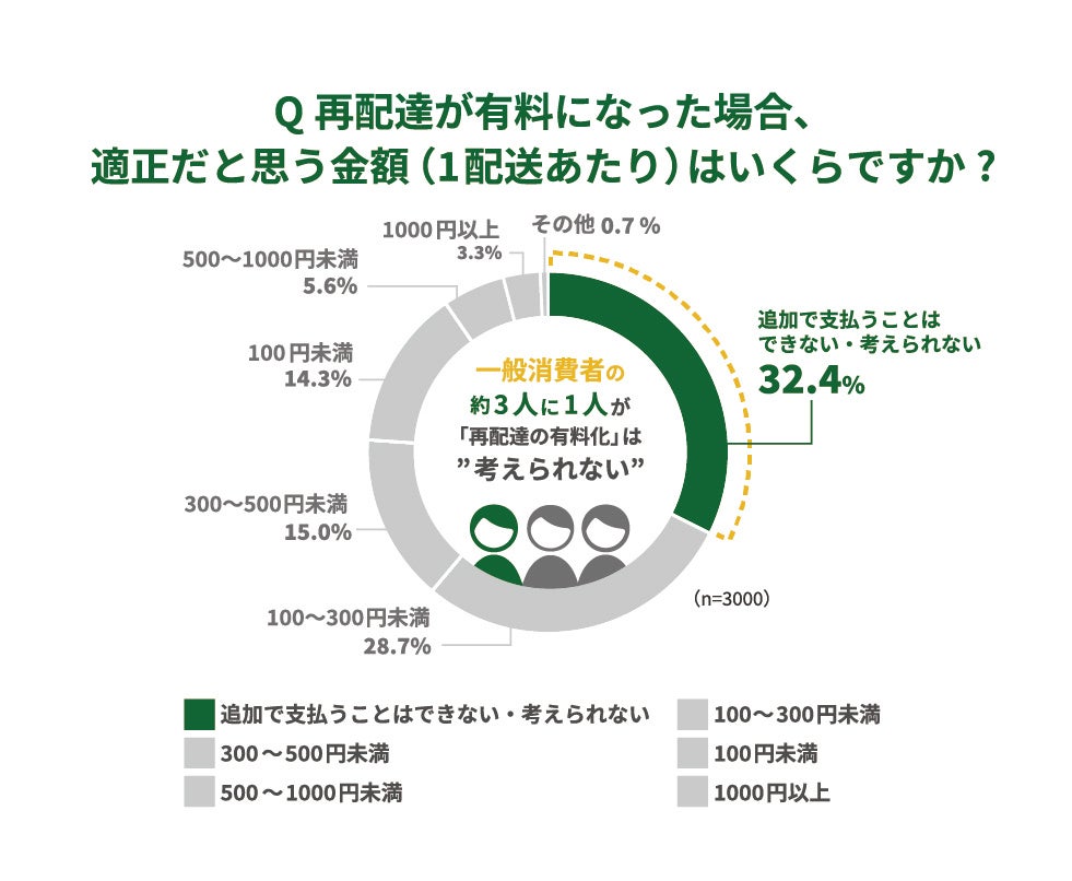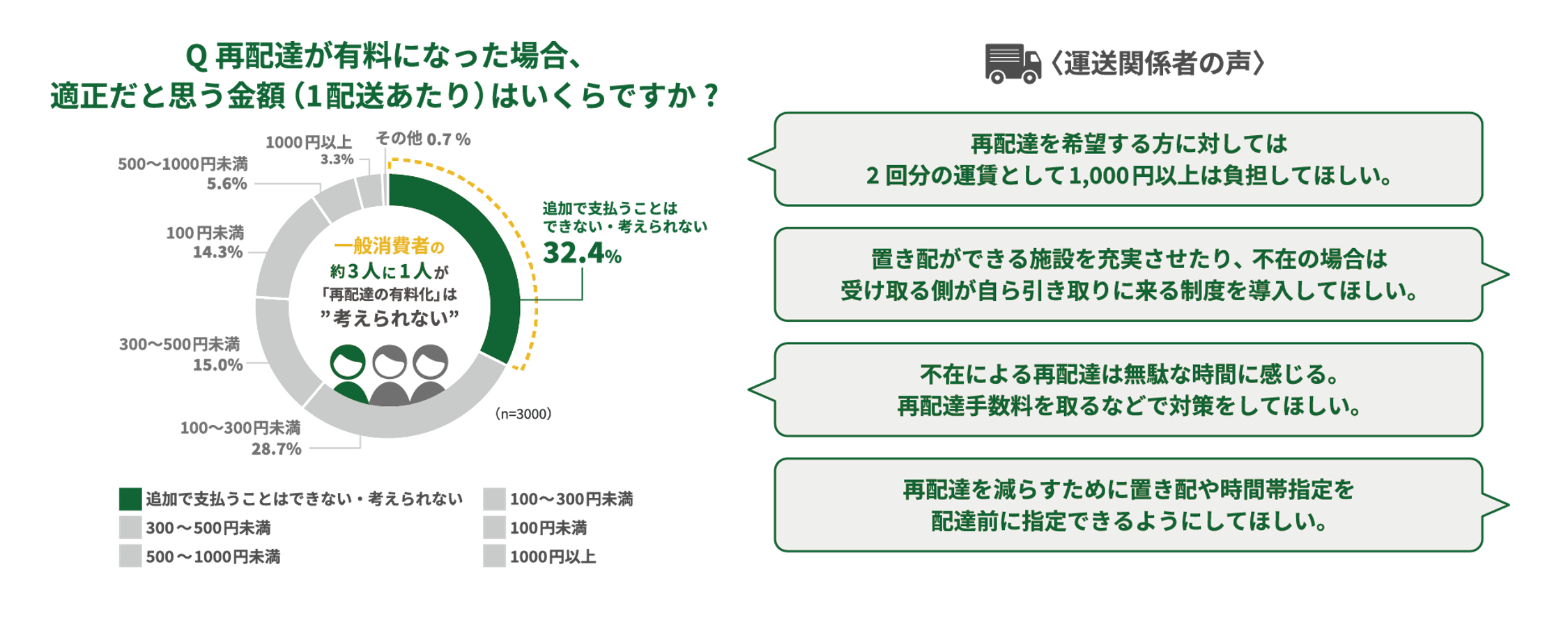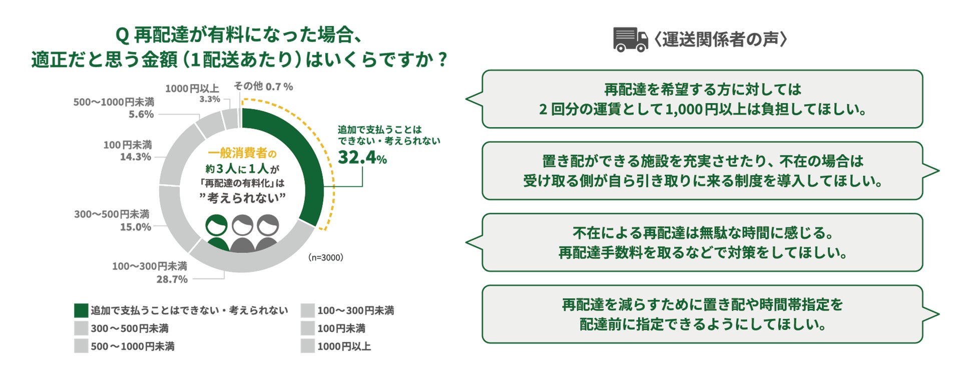 ②運送関係者が「再配達の有料化」への理解を求めるも、一般消費者の約3人に1人が「考えられない」と回答