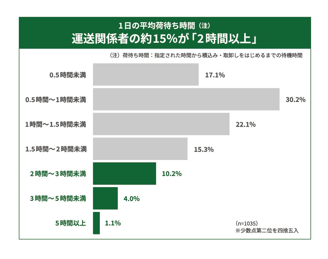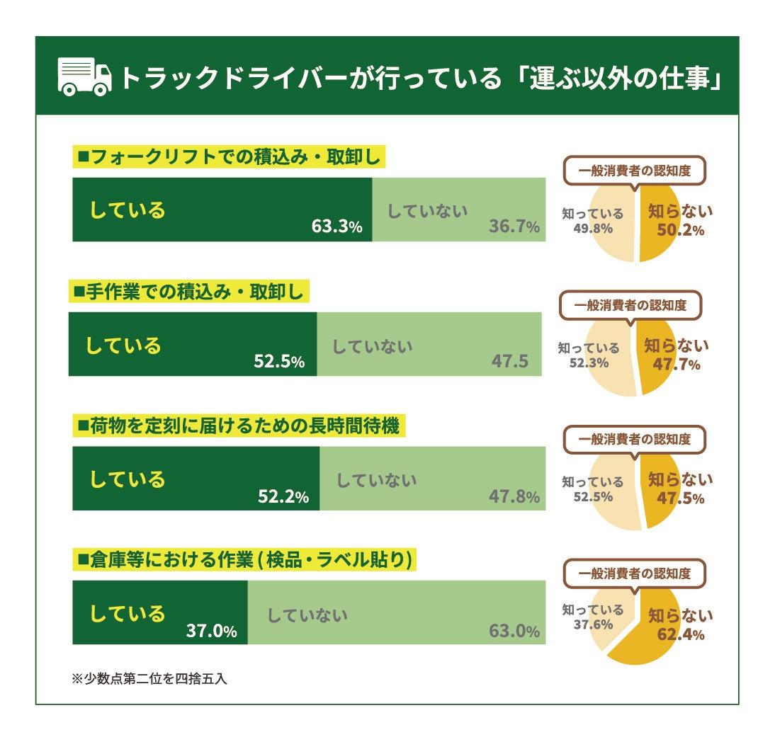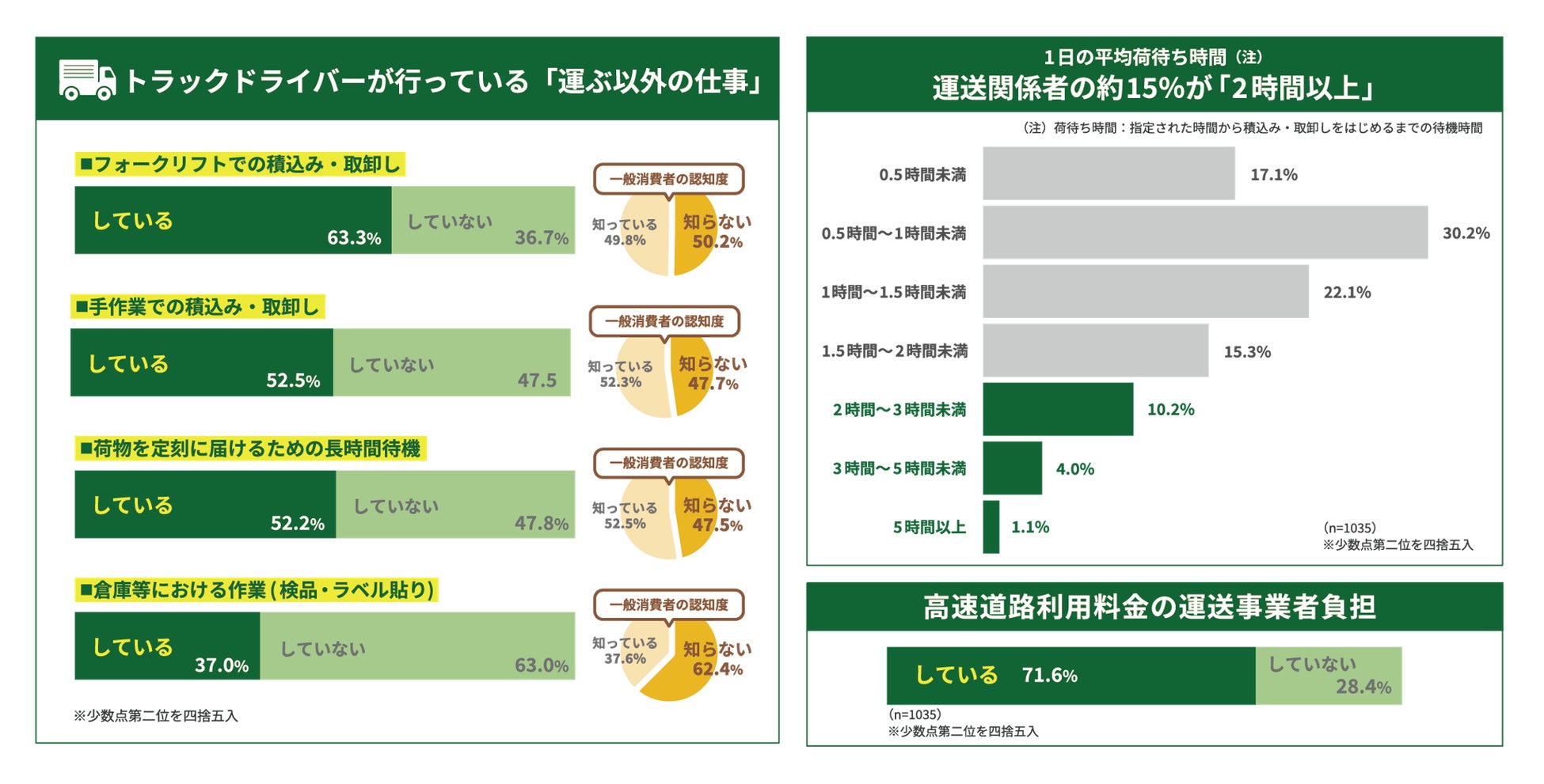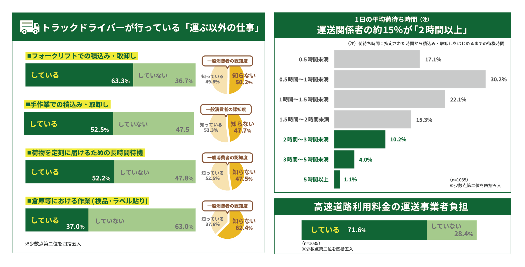 中でも、指定された時間から積込み・取卸しをはじめるまでの「1日の平均荷待ち時間」に関しては、運送関係者の約15%が「2時間以上」と回答。また、トラックドライバーの「運ぶ以外の仕事」に関して、一般消費者の半数近くが認知していないことが明らかになりました。