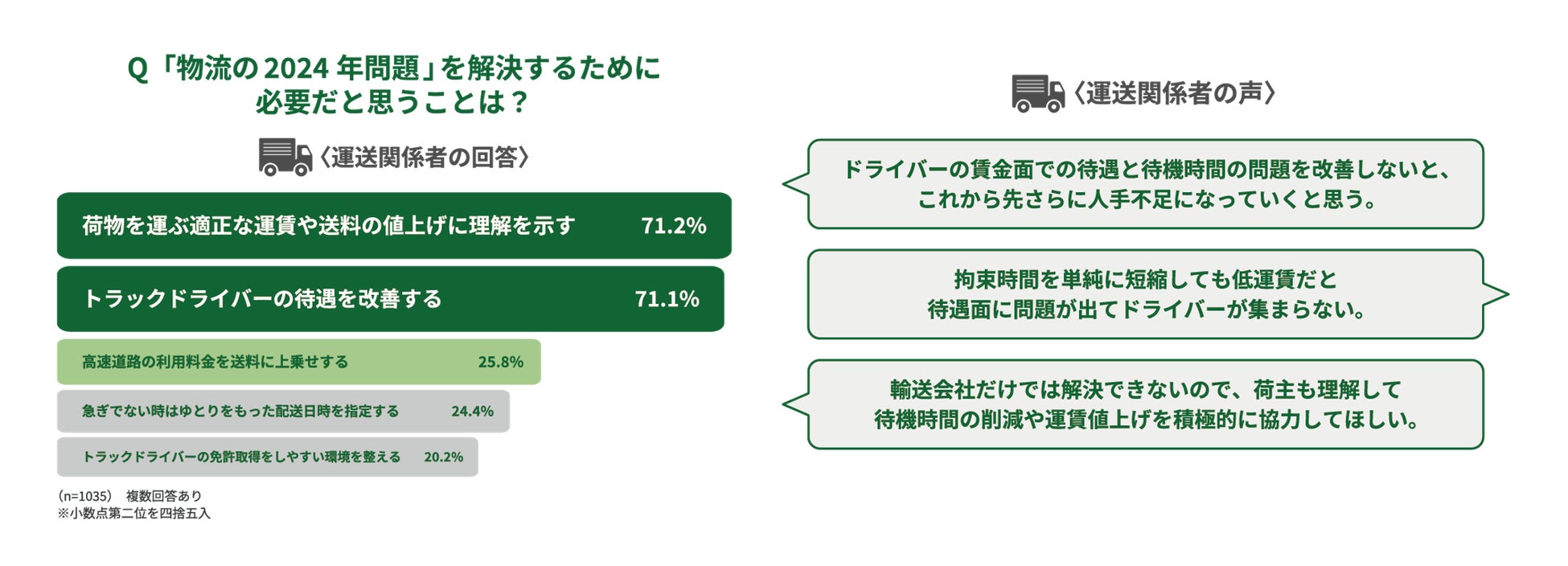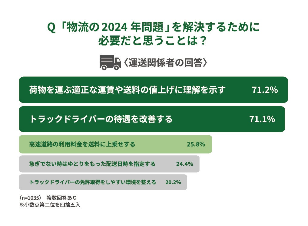 運送関係者の約7割が、「物流の2024年問題」を解決するためには「荷物を運ぶ適正な運賃や送料の値上げに理解を示す」、「トラックドライバーの待遇を改善する」ことが必要と回答しました。