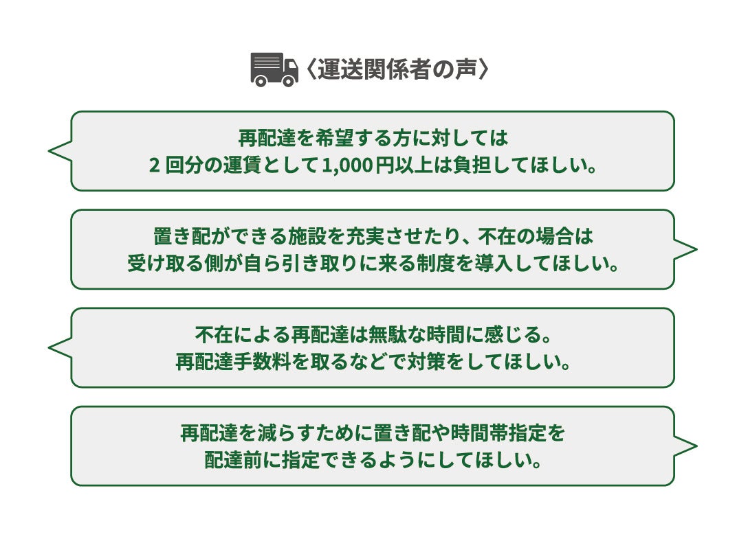 運送関係者からは、(仮に宅配の場合)「再配達を希望する方に対しては2回分の運賃として1,000円以上は負担してほしい」、「置き配ができる施設を充実させたり、不在の場合は受け取る側が自ら引き取りに来る制度を導入してほしい」など、有料化やトラックドライバーの負担を軽減するための対応策を求める声が多くあがりました。