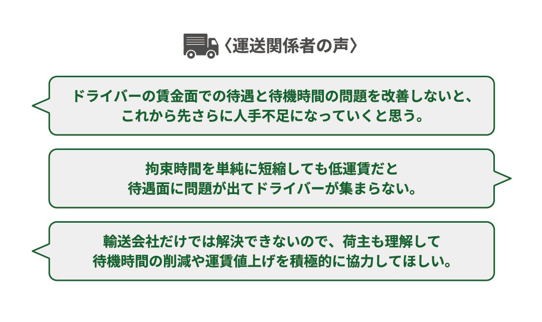 これらのトラックドライバーの実態について、運送関係者からは「法改正によってトラックドライバーの労働時間に上限が課されているが、予定外の待機や商品の持ち帰りなど発荷主・着荷主都合により拘束時間が増えてしまっている」など、改善を求める声が多く寄せられました。