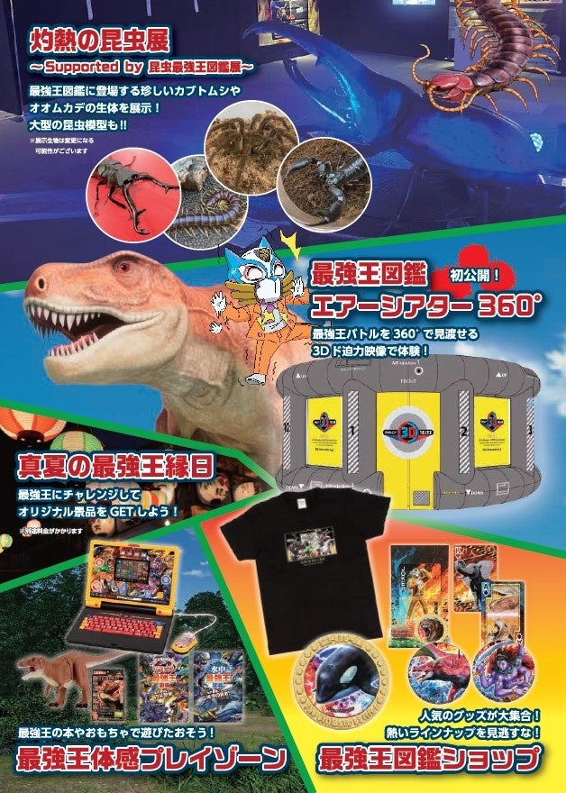会場ではアニメ「最強王図鑑~The Ultimate Battles~」の3Dシアターを世界初公開。大迫力の最強生物同士のバトルを360°で見渡せる3D映像で体験できます。また「灼熱の昆虫展~Supported by 昆虫最強王図鑑展~」では「最強王図鑑」に登場するぺルビアンジャイアントオオムカデやヘラクレスオオカブトなど珍しい生体と、大迫力の大型昆虫模型を展示。そして休憩スペースも兼ねた最強王体感プレイゾーンでは自由に「最強王図鑑」シリーズの書籍の試し読みやおもちゃの試遊をしていただくことができます。さらに、真夏の最強王縁日では3種類のゲームで最強生物たちにチャレンジ。強敵を倒せば、ここでしか手に入らないオリジナル景品をゲットできます。盛りだくさんなアトラクションで最強王の世界をぜひお楽しみください。