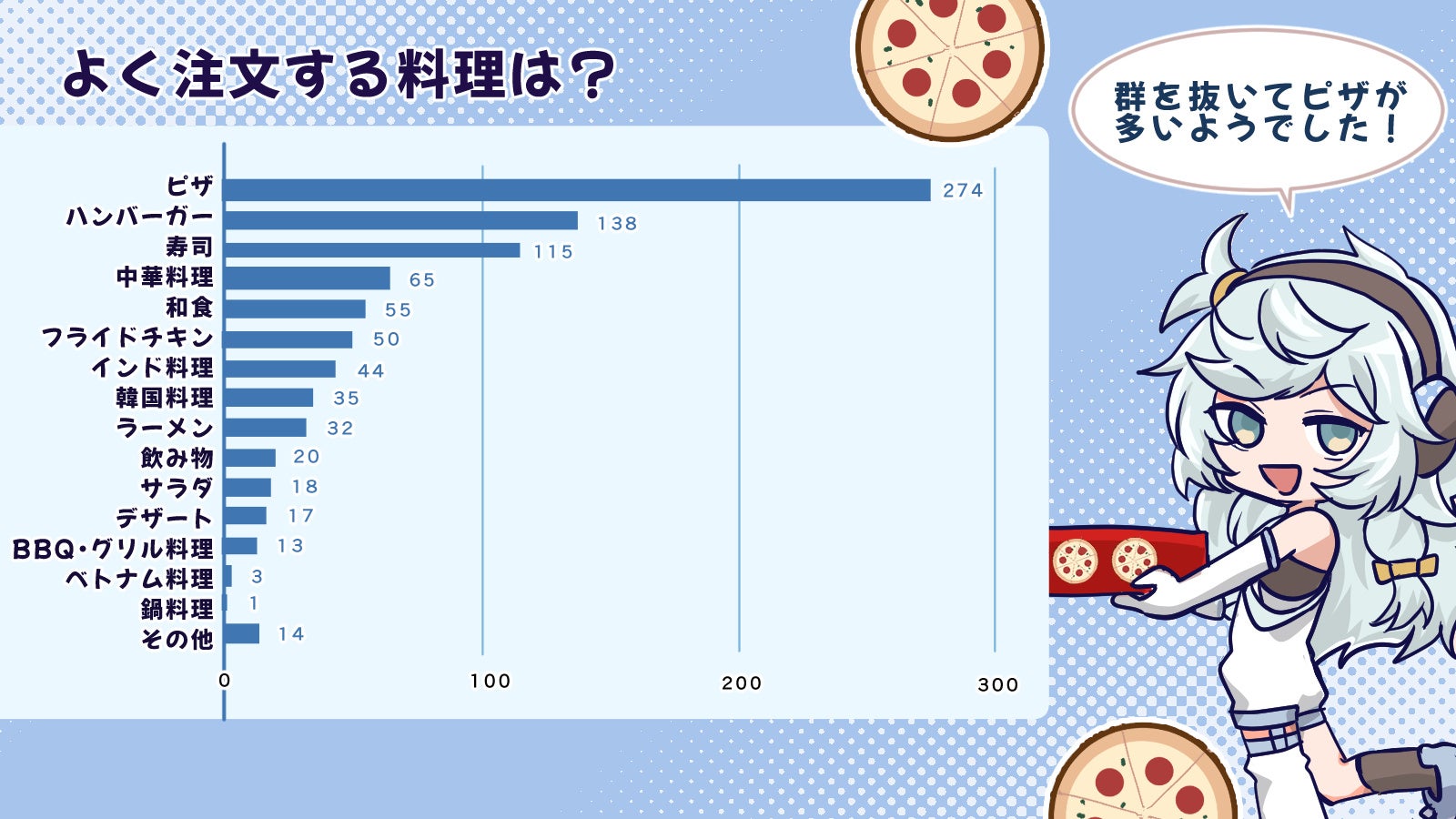 500名に複数回答可でアンケートをとった結果、ピザが274票で最多となりました。