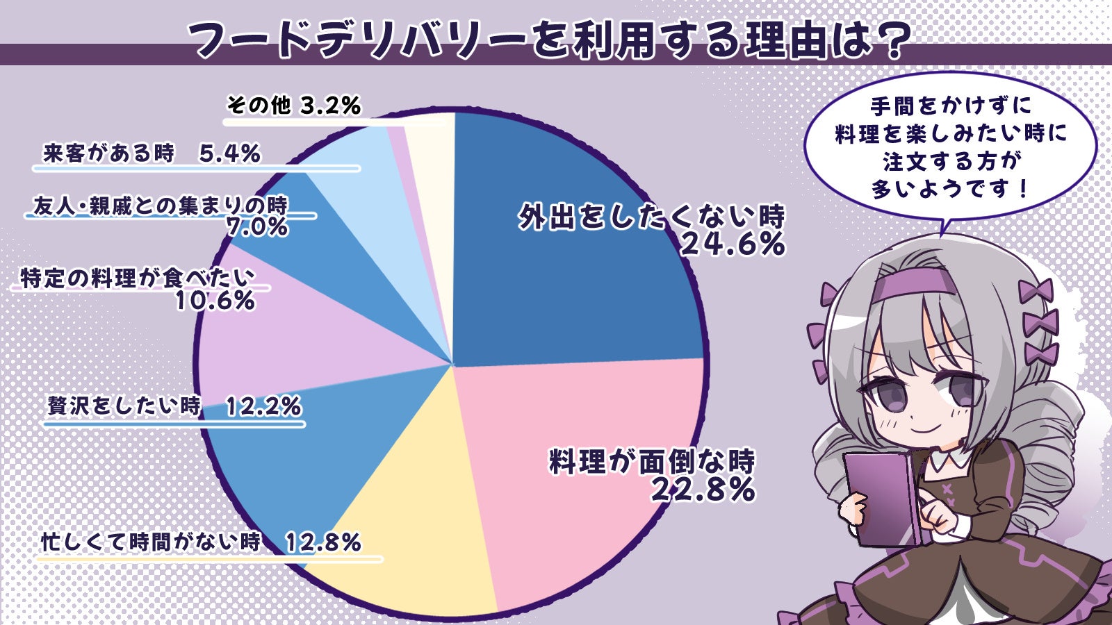 これら2つの理由が全体の約半分を占めることから、手間をかけずに料理を楽しみたい場合に注文する方が多いようです。