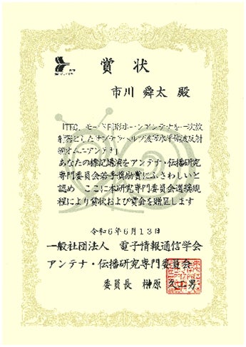 この度は、AP研若手奨励賞を授与いただき大変光栄に存じます。今後とも、最新の研究で要求されるアンテナや社会ニーズに沿ったアンテナをいち早く提供できるよう研究・開発により一層、精進してまいる所存でございます。