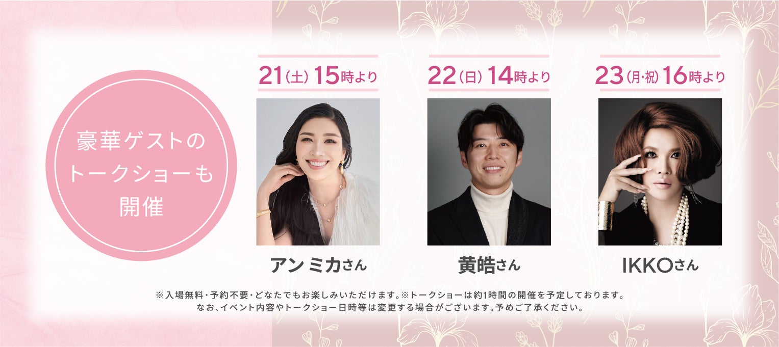 イベント期間中は以下の豪華ゲストによる「美と健康」をテーマにしたトークショーを連日予定しており、事前のご登録は不要でどなたでも無料でご観覧いただけます。期間中にご来場いただいた方にはQVCでのお買い物にご利用いただける1,000円のクーポンを全員へ差し上げるほか、毎日先着300名様へ素敵なビューティーセットのプレゼント*もご用意しています。皆さまのお越しを心よりお待ちしています。