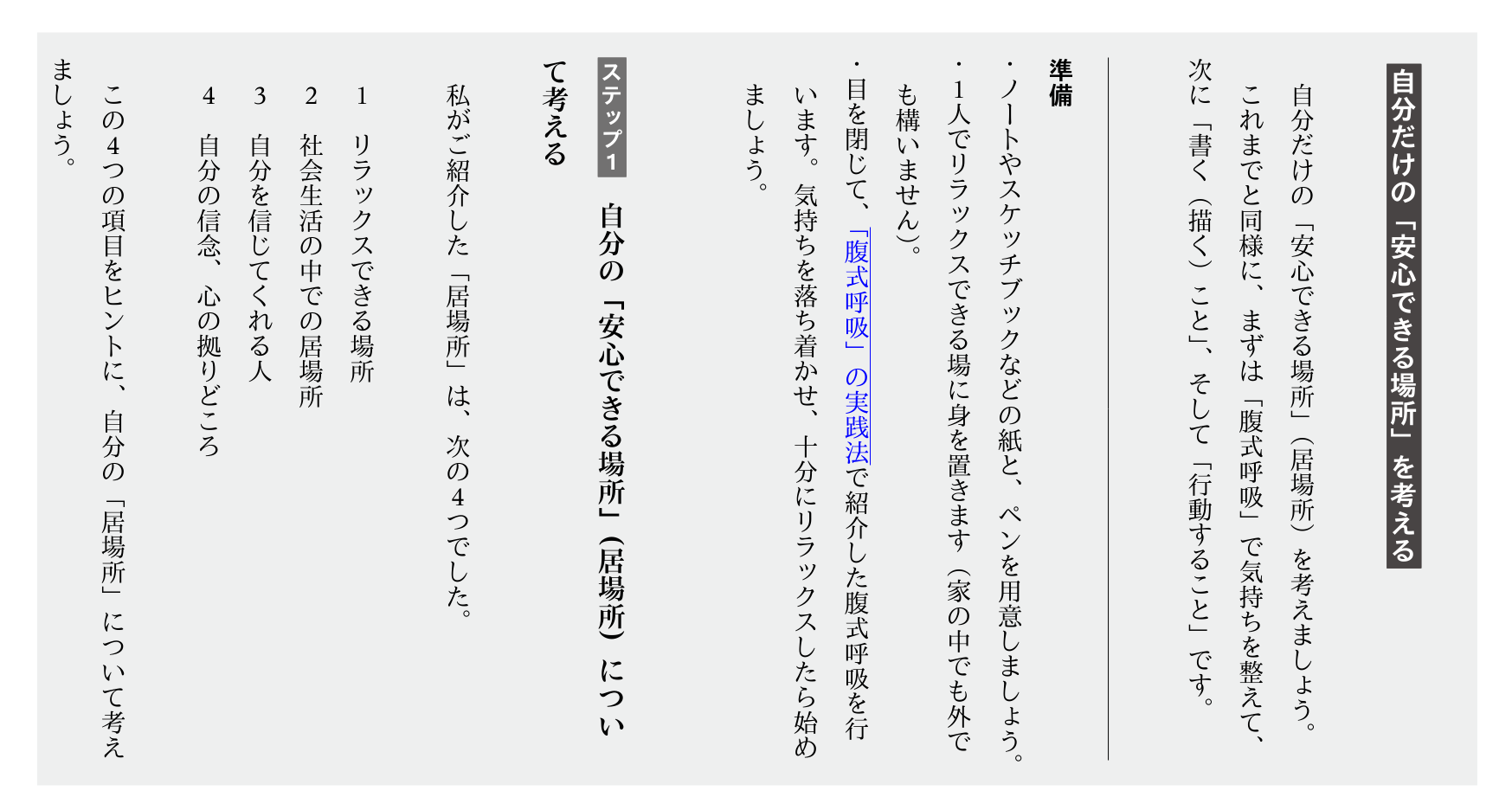 腹式呼吸・ノートに書く(描く)こと・行動すること。