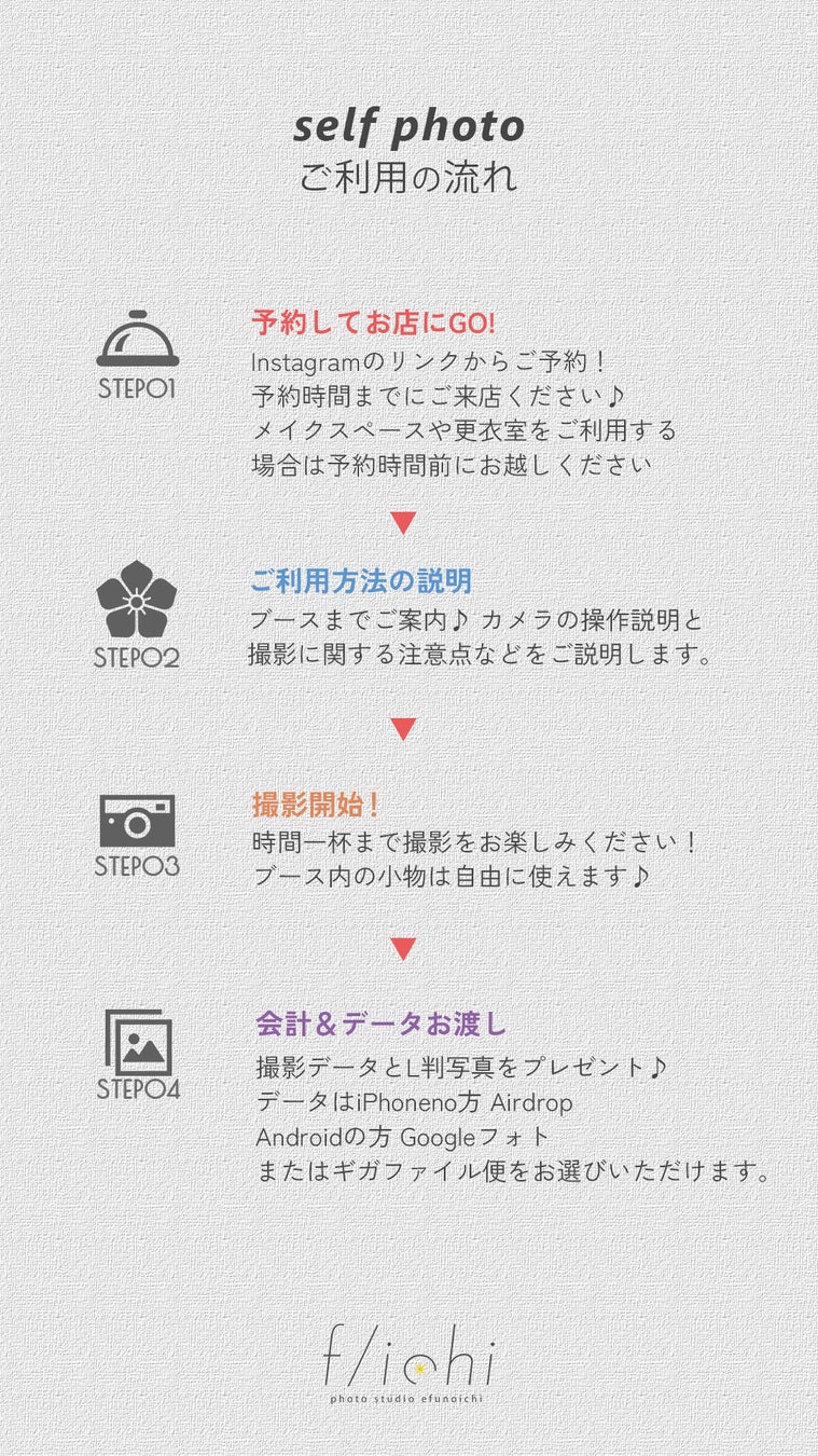 Instagramのリンクからご予約。予約時間までにご来店ください。メイクスペースや更衣室をご利用する場合は予約時間前にお越しください。