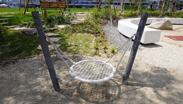 また、車いすや歩行器を使う⼦供も利用できるインクルーシブ遊具を設置しています。既存の森の環境を活かしつつ、誰もが安全に、そして楽しく過ごせる遊び場となります。