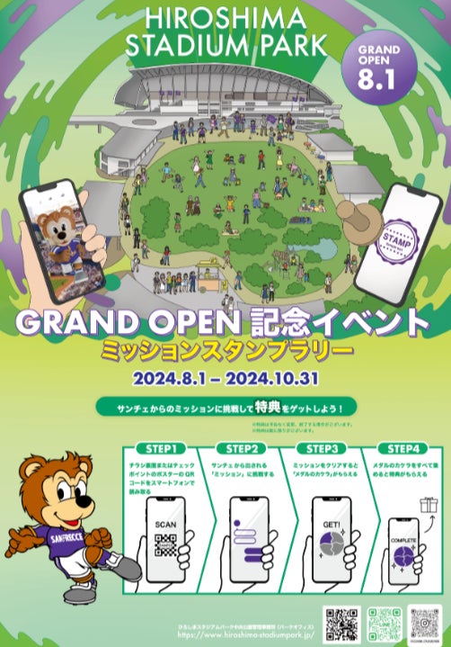2024年8月1日(木)から10月31日(木)まで、チャットボット機能を活用してサンフレッチェ公式マスコット「サンチェ」と会話を楽しみながら行う、ストーリー体験型スタンプラリーを開催します。公園内に設置されたチェックポイントを巡りながら、ARを用いたミッションに挑戦しクリアをめざすイベントです。全ミッションをクリアした方には、HiroPa各店舗で使えるクーポンをプレゼントします。「ひろしまスタジアムパークフェスタ」の2日間はもちろん、終了後も魅力あふれるひろしまスタジアムパークとHiroPaを感じていただけるイベントです。詳細情報は公式ホームページをご参照ください。 https://www.hiroshima-stadiumpark.jp/news/event/post-072202/