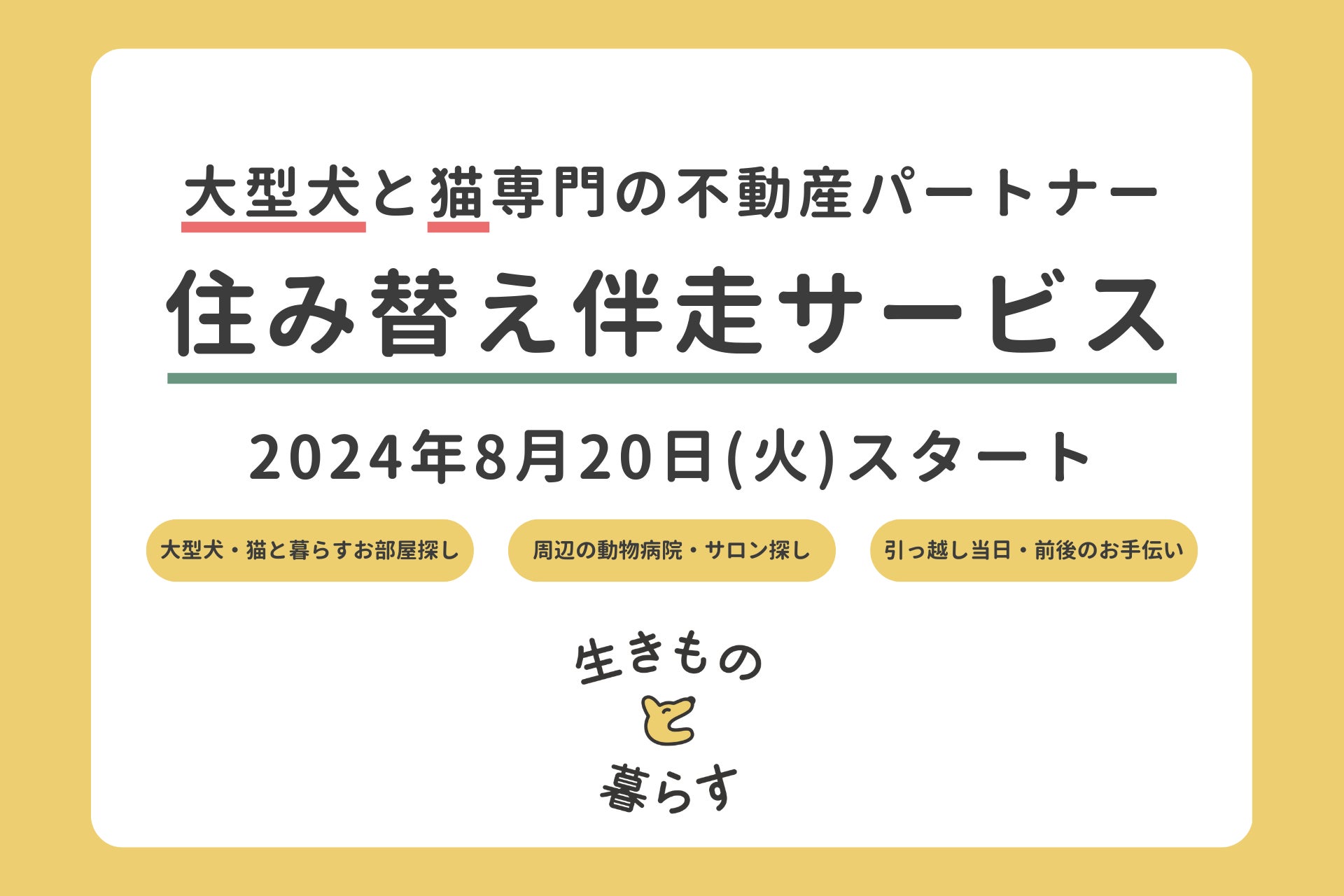 株式会社生きものと暮らす(所在地:東京都世田谷区、代表取締役:永瀬もなみ、以下:当社)は、大型犬と猫に特化した新しい不動産・暮らしの総合サービス「住み替え伴走サービス」を2024年8月20日(火)よりスタートします。「住み替え伴走サービス」とは、お客さまに専任のパートナーがつき、家を探す段階から引っ越した後まで、ペットとの住み替え全体をサポートするサービスです。大型犬と猫に特化した不動産サービスは業界初※1です。※1 自社調べ