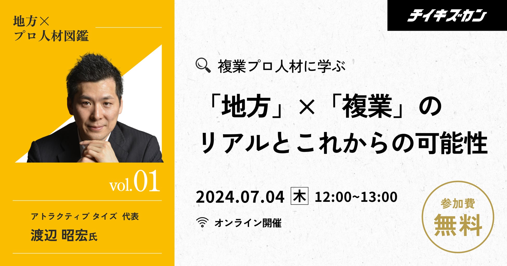 そこで、今回「チイキズカン」を実際に活用し、地方での複業に取り組むプロ人材の方やチイキズカン掲載地方企業の方にご登壇いただき、「地方×複業の実体験」について、それぞれの目線からお話いただく、オンラインイベントを開催いたします。これをきっかけに、より多くのプロ人材が、地方に興味を持ち、地方企業に関わり、地方企業の未来を変えていけるようにXLOCALは挑戦し続けます。