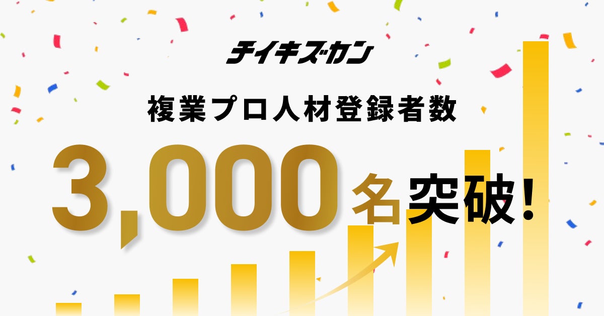 地方企業×プロ人材複業マッチングの「チイキズカン」がリリースから9ヶ月で複業プロフェッショナル人材の登録者数3,000名を突破しました