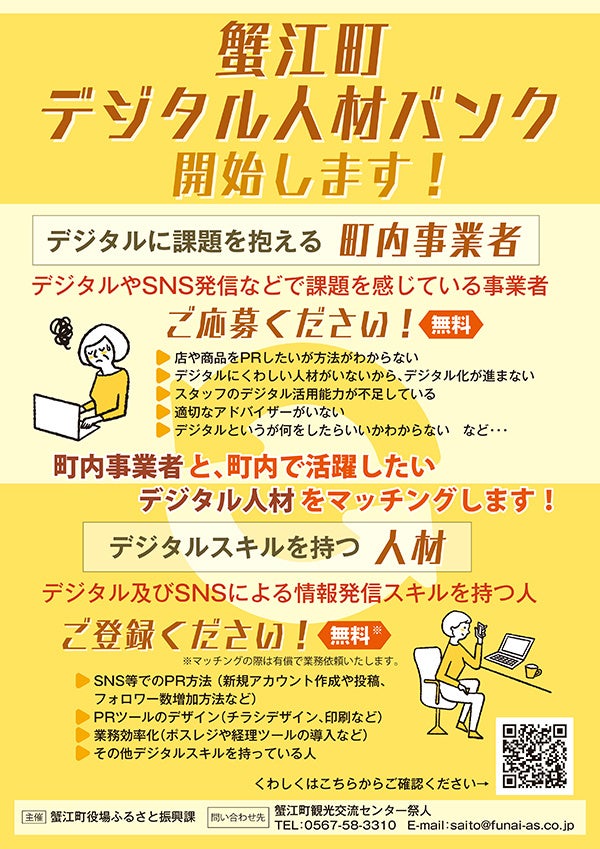 令和6年度蟹江町デジタル人材バンクがスタートしました。デジタル化に課題をかかえる町内事業者をデジタルスキルをもつ人材とマッチングします。