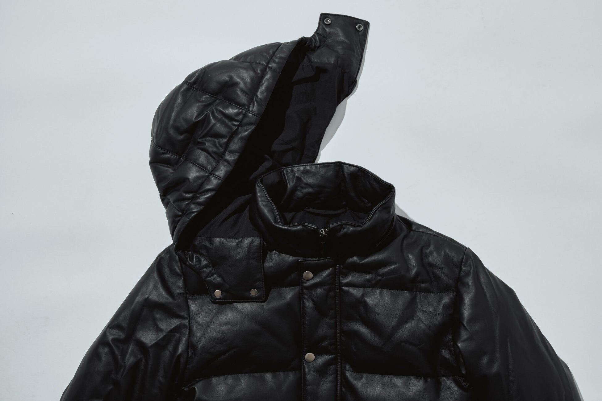 内側には白色のガチョウの羽毛から採れる希少なグースダウンを使用。ダウンにはさまざまな種類がありますが、その中でもグースダウンはきわめて保湿力が高く、高価なダウンに採用されるものです。見た目は真っ黒で重厚感のあるデザインですが、着てみると圧倒的な軽さに驚かれることと思います。