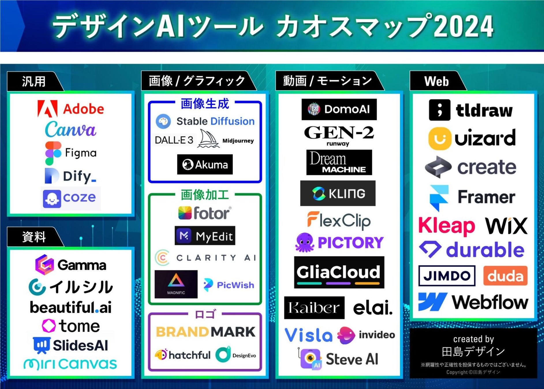本調査は下記ツールを対象に調査いたしました(デザインAIツールカオスマップ2024)。