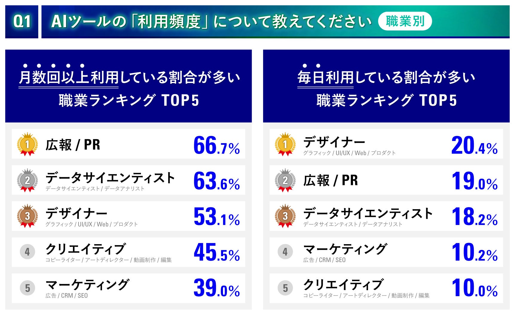 利用頻度について、職業別でランキング形式にしてみました。特に「デザイナー」は、月数回以上利用している方は53.1%(2人に1人以上)、毎日利用している方は20.4%(5人に1人以上)という結果となりました。