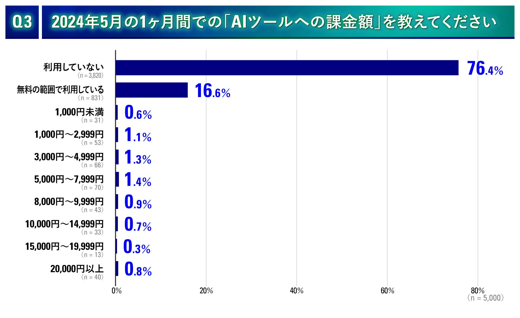 2024年5月の1ヶ月間での「AIツールへの課金額」を調査したところ、「利用していない76.4%」と「無料の範囲で利用している16.6%」の合計93%の方がAIツールに課金していないことがわかりました。つまり、7%の方はAIツールに課金しているということになります。