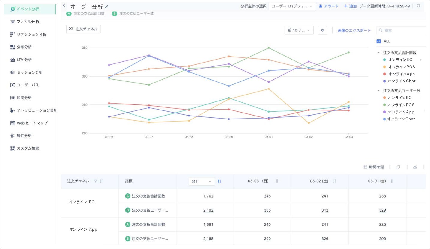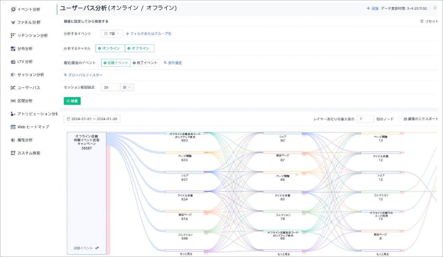 イベント分析、リテンション分析、アトリビューション分析、ファネル分析、ユーザーパス分析、LTV分析など、オンラインだけでなくオフラインのデータも活用しつつ、さまざまな側面からの行動解析が可能。