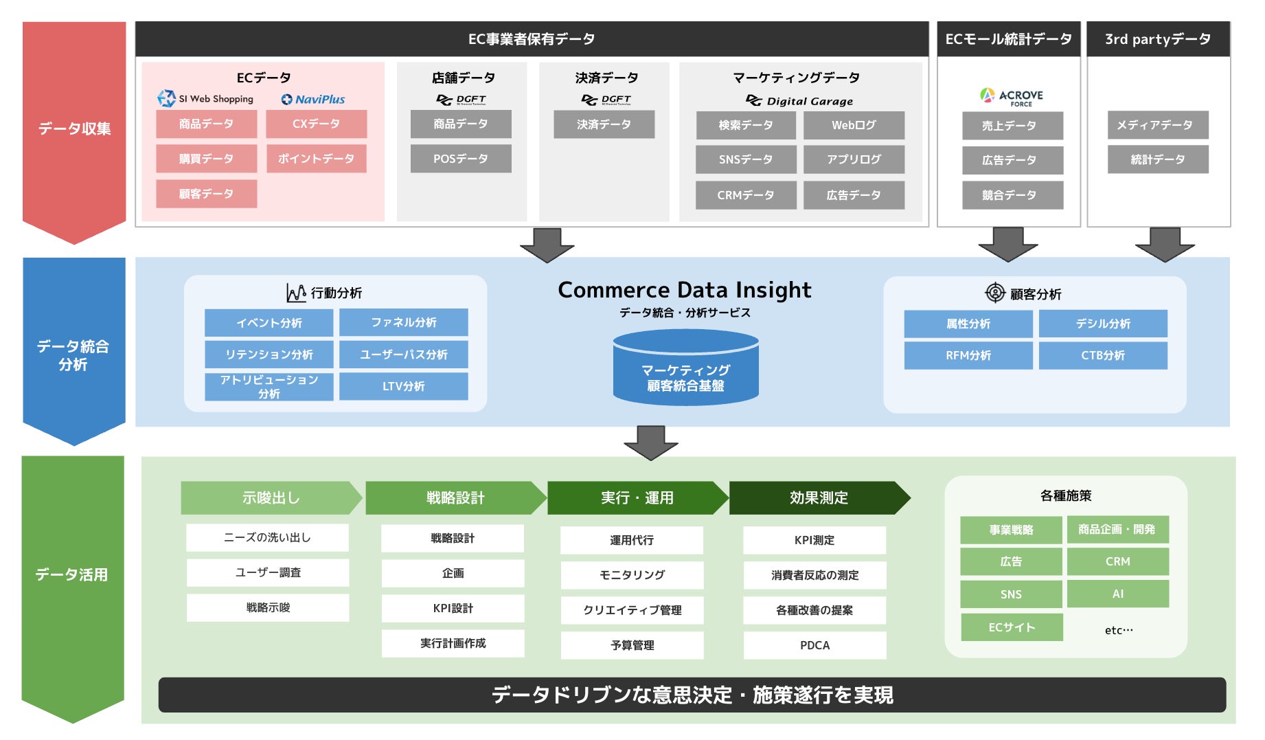 「Commerce Data Insight」は、EC事業者やACROVEが保有する各種データや3rd Partyデータ等のデータリソースを収集・統合し、多岐にわたる分析機能をもとにデータドリブンな意思決定や施策遂行を実現するデータマネジメントプラットフォームです。「Commerce Data Insight」がデータ活用に関わるすべてのプロセスをカバーし、示唆出し、戦略設計、実行運用、効果測定まで、一連のプロセスをサポートするため、事業戦略の立案や改善、広告運用の最適化、SNSプラットフォームでのターゲティング、ECサイトの改善、新商品の企画・開発、CRM戦略の強化、AIを活用したパーソナライゼーションなど、多岐にわたる施策のスピーディーな実行を強力に支援します。