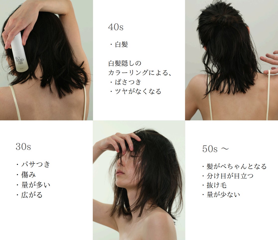 美容師の久保によると、年代別の髪のお悩みは次の通りです。誰もが経験する白髪隠しの時期から悩みはどんどん深刻になっていきます。しかしアイテム選びとスタイリングの仕方次第でほんの少しだけ気持ちが軽くなるサポートをiTOKUHASHiより提案できればと思っています。