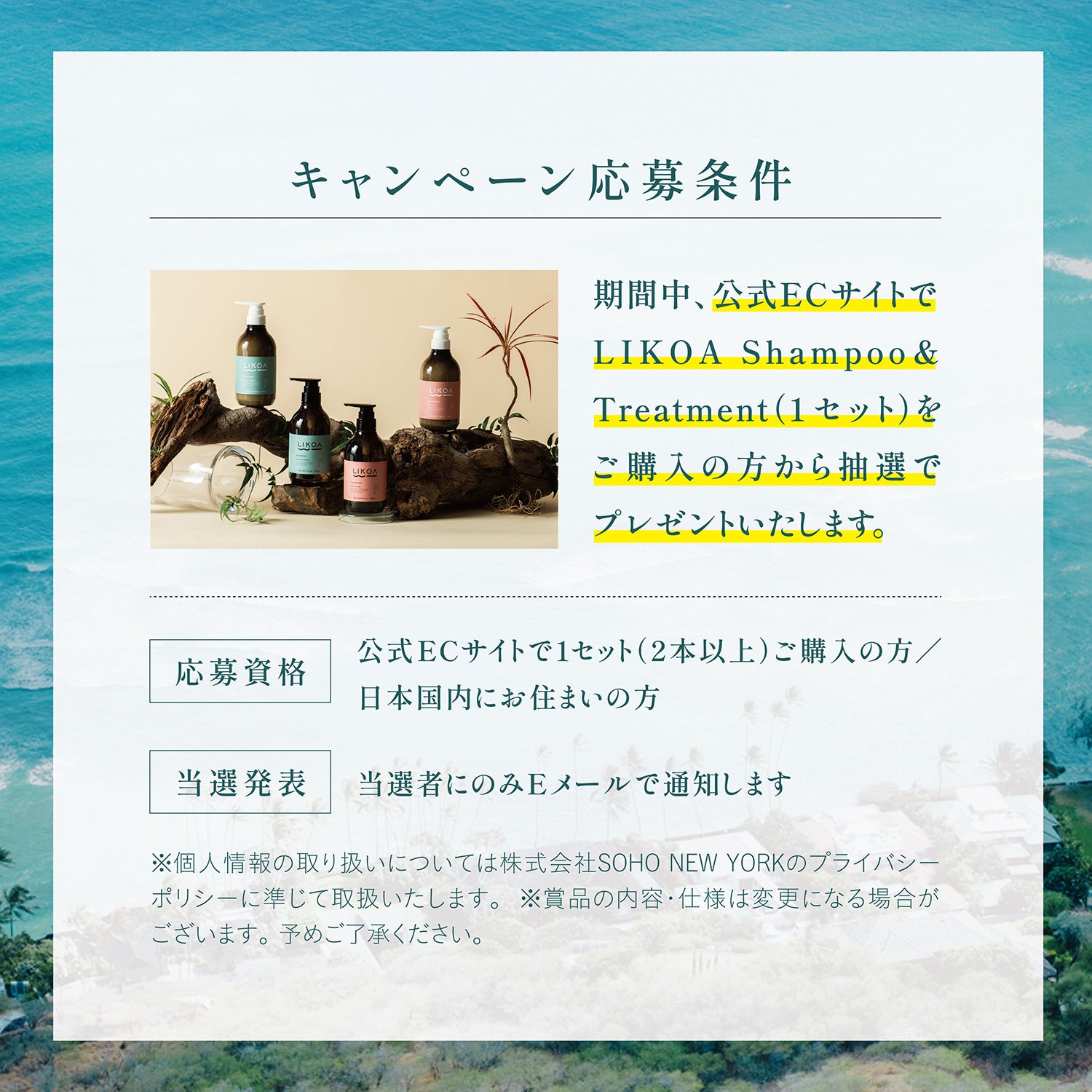ダメージを補修し潤いつづく、本来の美しい髪へ「 MOIST & CHILL(モイスト&チル)」、サラサラしなやか、髪のチューニングケア「 SMOOTH & NEUTRAL(スムース&ニュートラル)」2つのShampoo&Treatmentを展開しており、キャンペーン期間中、公式ECサイトでいずれか1セットをご購入に方の中から「8万円分の旅行券」を5名様へ、「2万円分のハワイアングッズ」を20名様へ抽選でプレゼントします。キャンペーン期間中にLIKOA商品をご購入いただき、自分らしい時間をお楽しみください。