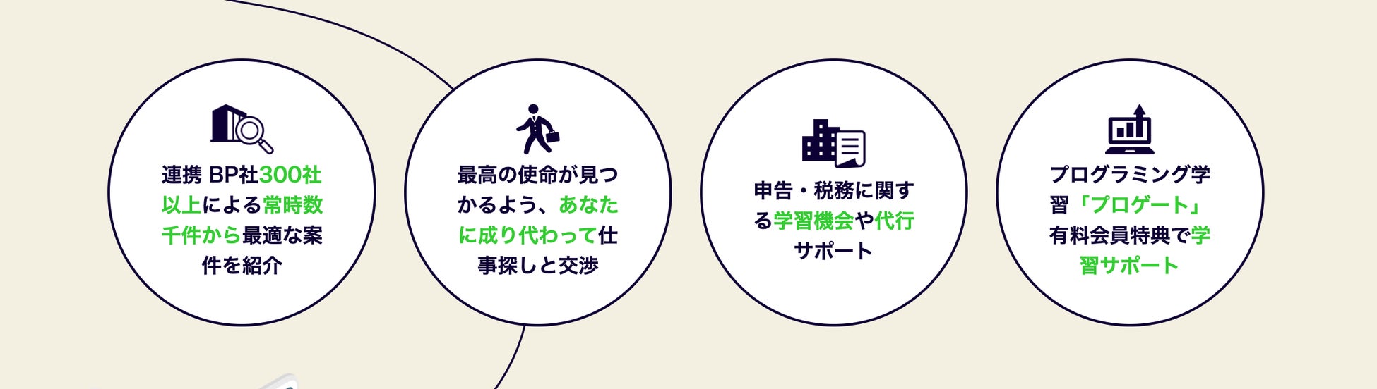 多種多様の選択肢から選べる案件獲得支援のほか、参画が決まった後は、継続キャリア支援、スキルアップ支援、税務申告の対応支援、福利厚生サービス特典など、フリーランスが必要としている支援を全面的に、多角的に行います。
