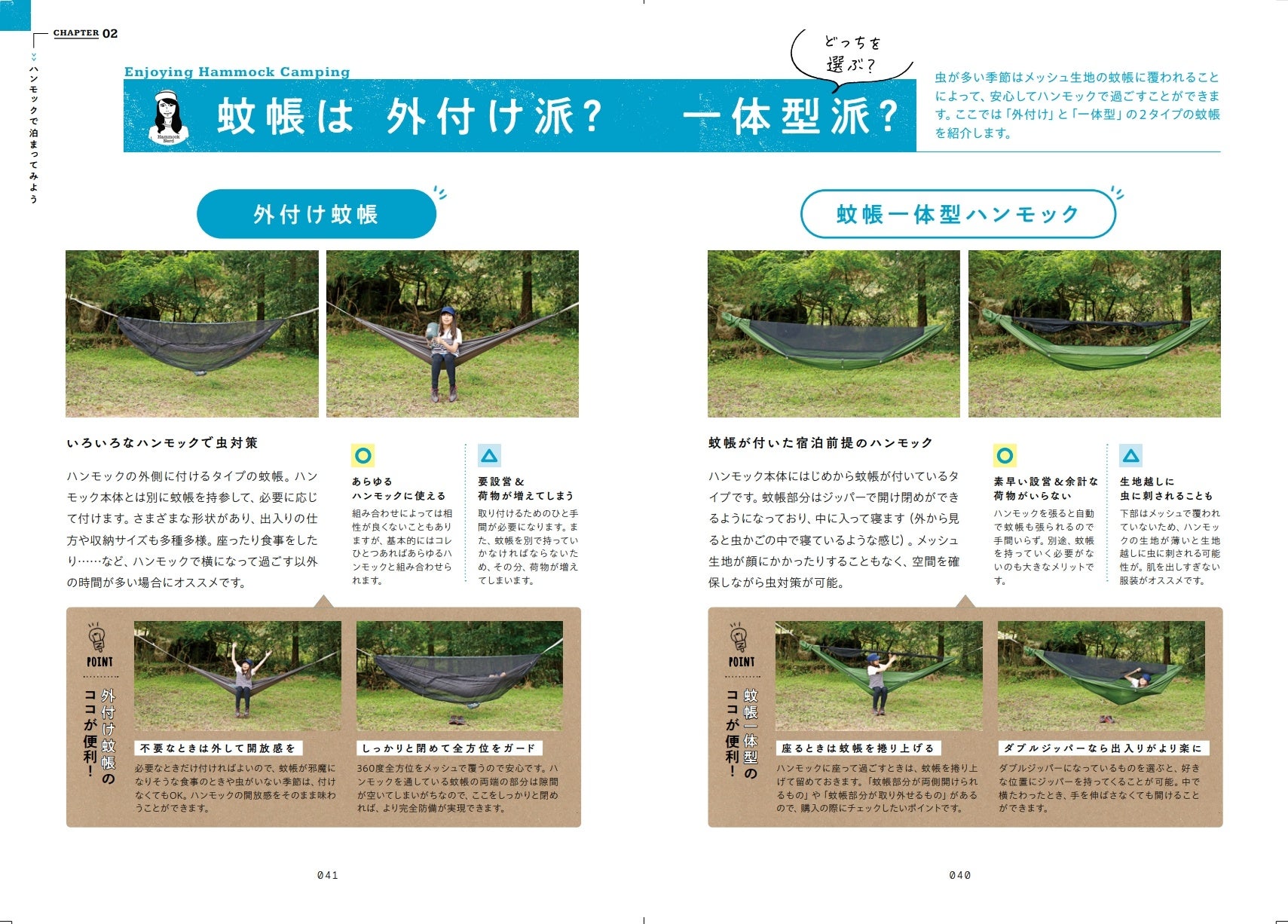ハンモックキャンプに必要な道具の紹介はもちろん、設営&撤収の基本、タープの張り方、季節ごとの宿泊術などを丁寧に解説。また、オススメのハンモックカタログから、ハンモックがさらに楽しくなるオプションアイテムの紹介に至るまで幅広いコンテンツが用意され、この一冊があれば今すぐにハンモックキャンプを始められるガイド本となっています。