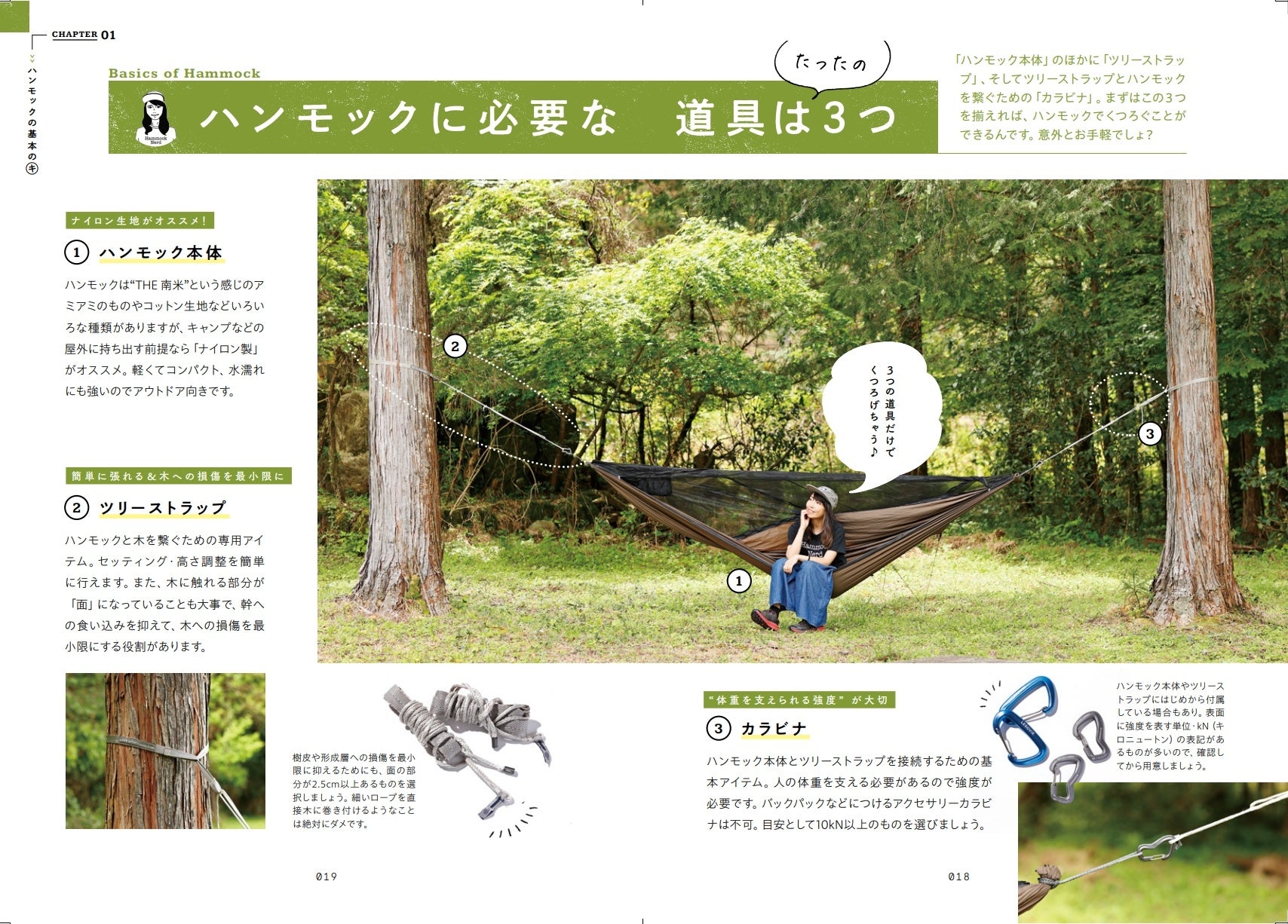 なかには、木にハンモックをかけること自体、「木を傷つけるのではないか?」と不安を抱くキャンパーさんがいるかもしれません。野沢さんはそのテーマに真剣に向き合い、本書では樹木医さんに取材をしたうえで、「ハンモックを張る際に正しい木の選び方、木のダメージを最小限にする方法」を紹介しています。