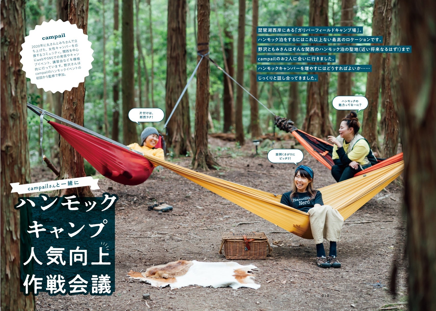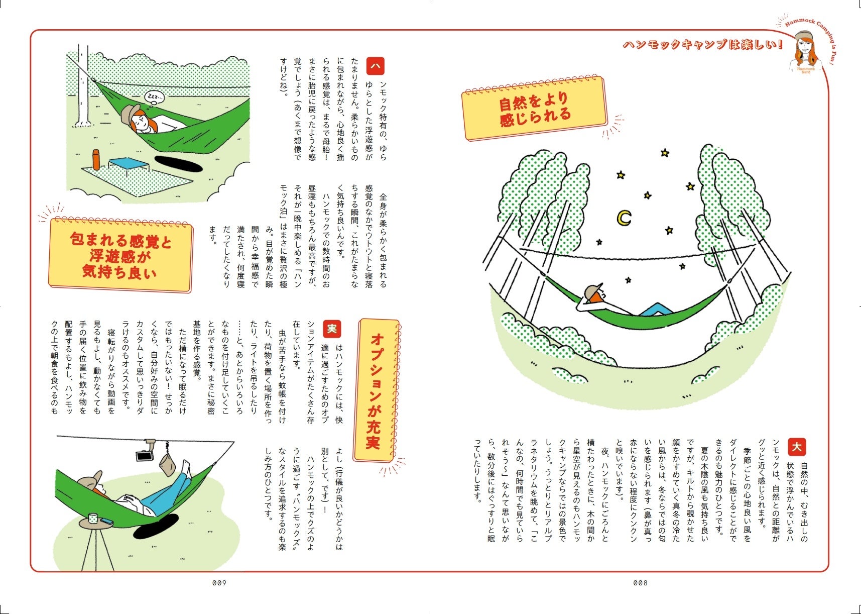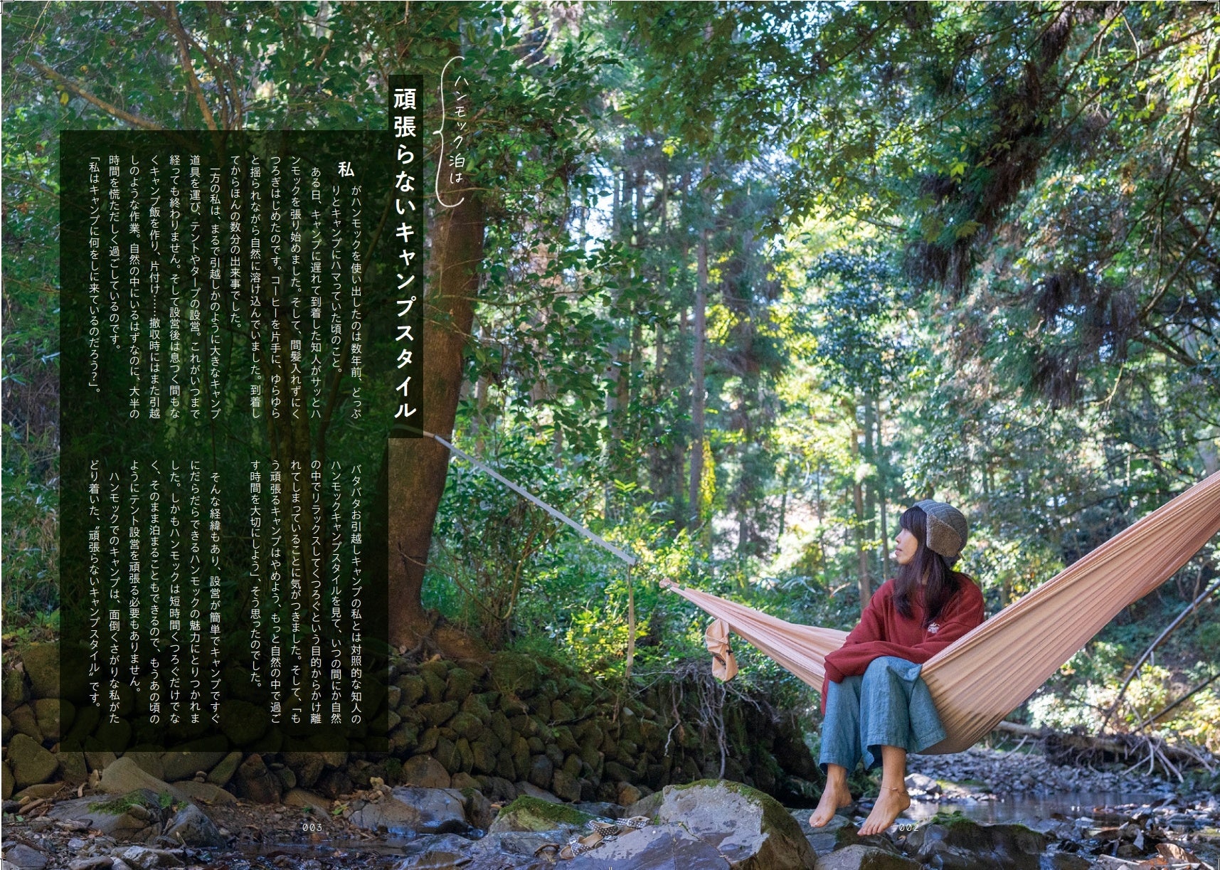 「キャンプは好きだけどハンモックキャンプはまだ未体験」という方は、ぜひ本書を読んで、一度はハンモックキャンプにトライしていただきたいと思います。もちろん体質的に合う・合わないはあると思いますが、こんな快適なキャンプスタイルを、食わず嫌いのままやらずにいるのは、本当に、勿体ないですから!