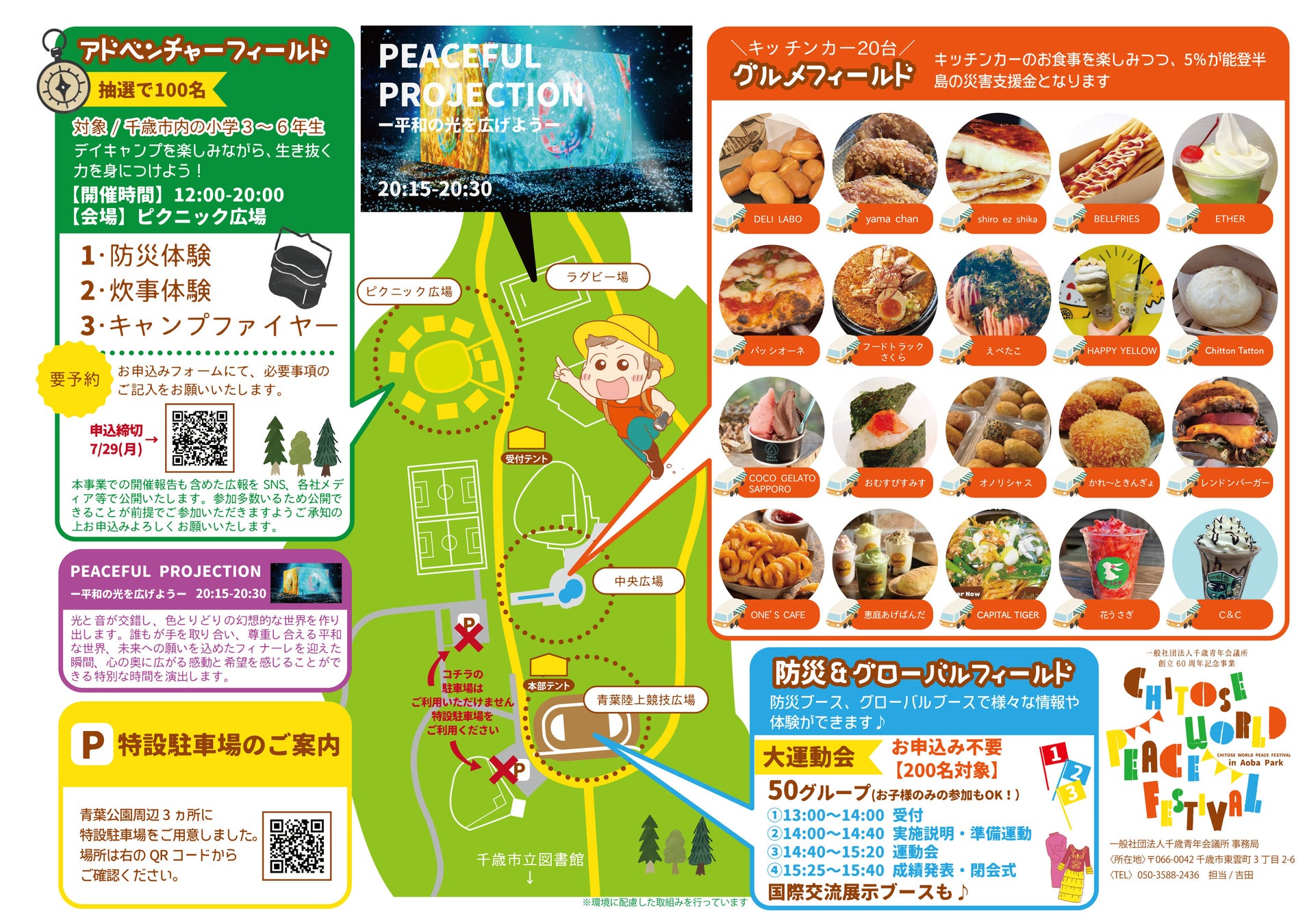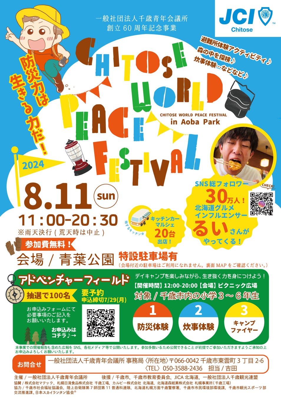 一般社団法人千歳青年会議所(北海道千歳市、理事長 斉藤 創)は千歳市⺠の憩いの場である道内屈指の自然豊かな総合公園『⻘葉公園』を舞台に「CHITOSE WORLD PEACE FESTIVAL」を2024年8月11日(日)に開催いたします。本事業は次世代のリーダーを生み出すべく、千歳市の子供たちが楽しみながら生き抜く力を身につける防災教育や、市内在住の外国籍との方と異文化交流の場を通して多様な価値観の理解とコミュニケーション力を高める場を創出します。自然と本事業の共生や仲間と共に過ごす時間によって、千歳の美しい自然環境を後世につなげ、郷土愛を育み、原体験を通して社会への適応力と多様性を尊重できる人財としての成⻑に寄与します。
