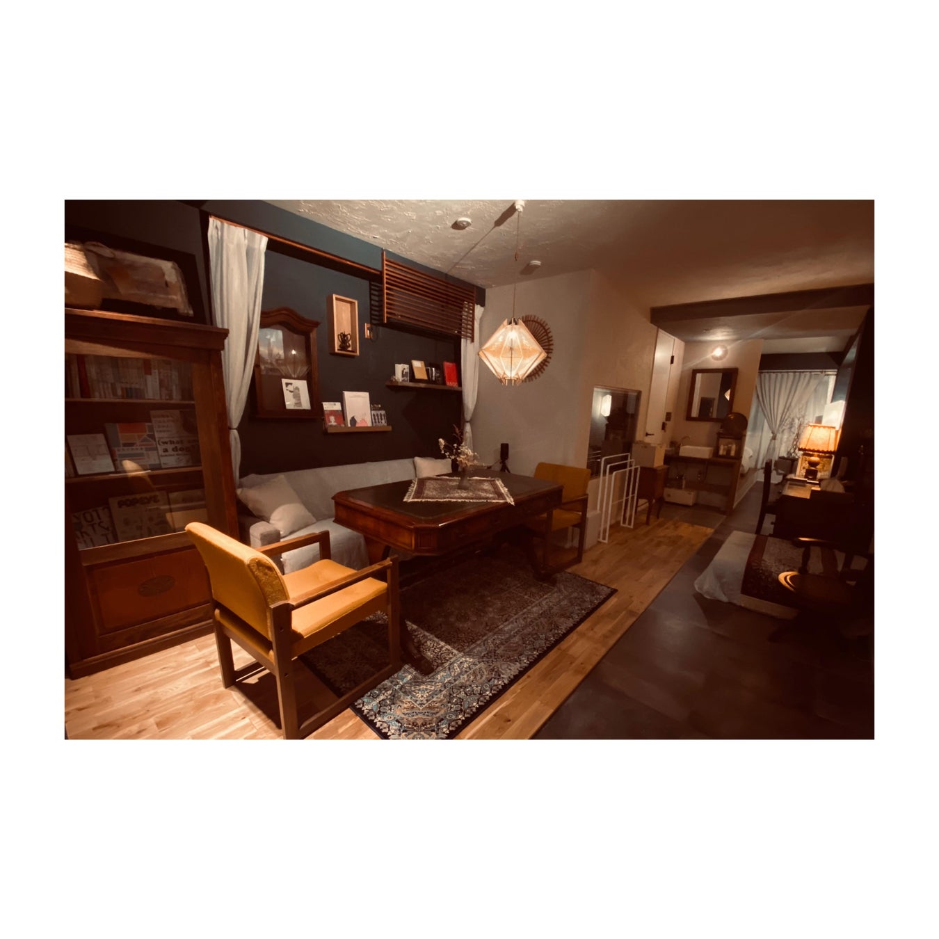 リビングと寝室を緩やかに区画したゆとりのある空間を、世界中から集めたヴィンテージの家具・雑貨や、アート・インテリア・暮らしを中心とした本や雑誌で包み込み、穏やかな時間を演出しています。