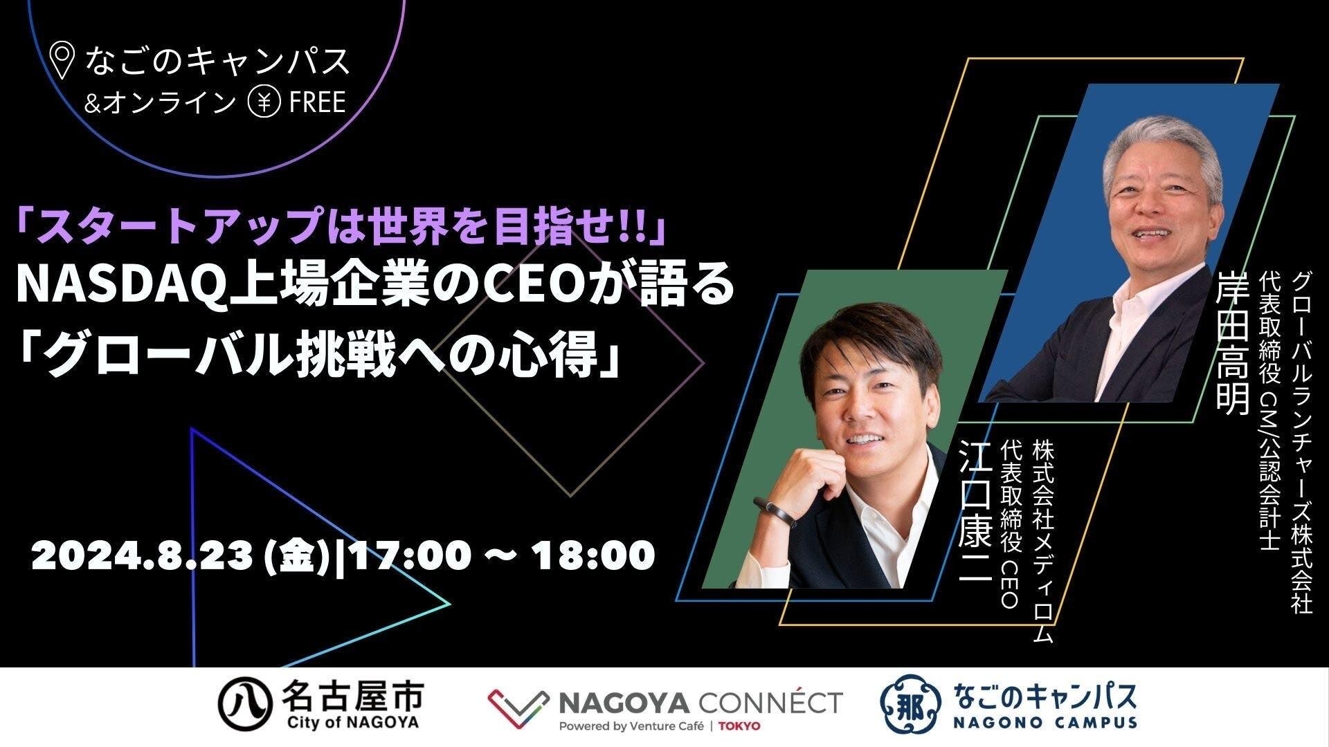 NASDAQ上場企業 株式会社メディロム CEO・江口康二氏が登壇!グローバルを目指す経営者向けセミナーが、なごのキャンパス(愛知県名古屋市)にて2024年8月23日(金)に開催されます。
