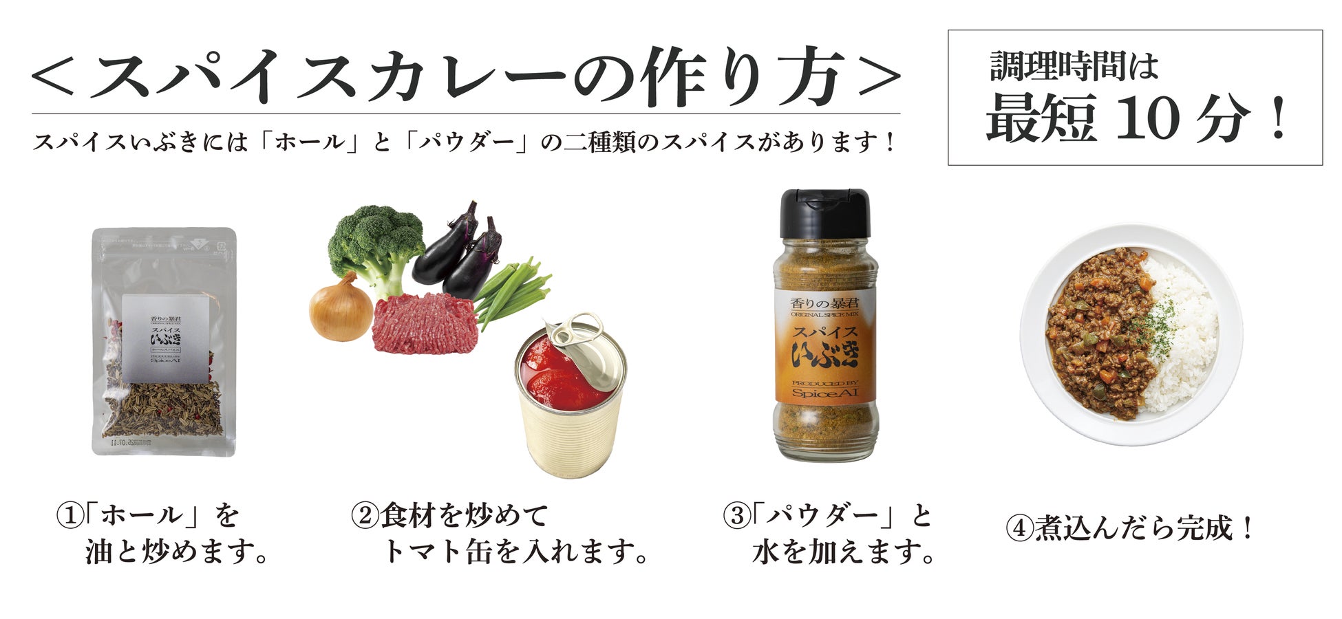 「スパイスいぶき」は、忙しい日常でも複雑な調理なしで手軽に本格的なスパイスカレーを楽しめるように開発した万能スパイスです。好きな食材を炒め、「スパイスいぶき」とトマト缶を入れるだけで、わずか10分でスパイスカレーが完成します。また、「スパイスいぶき」はカレーだけでなく、肉やスープ、野菜にも使える多用途性を持たせ、振りかけて良し、炒めて良しの万能スパイスです。厳選した15種類以上のスパイスを配合し、口に入れた瞬間から飲み込むまでに香りが変化するよう工夫しており、香りと味の両方で満足感を提供します。
