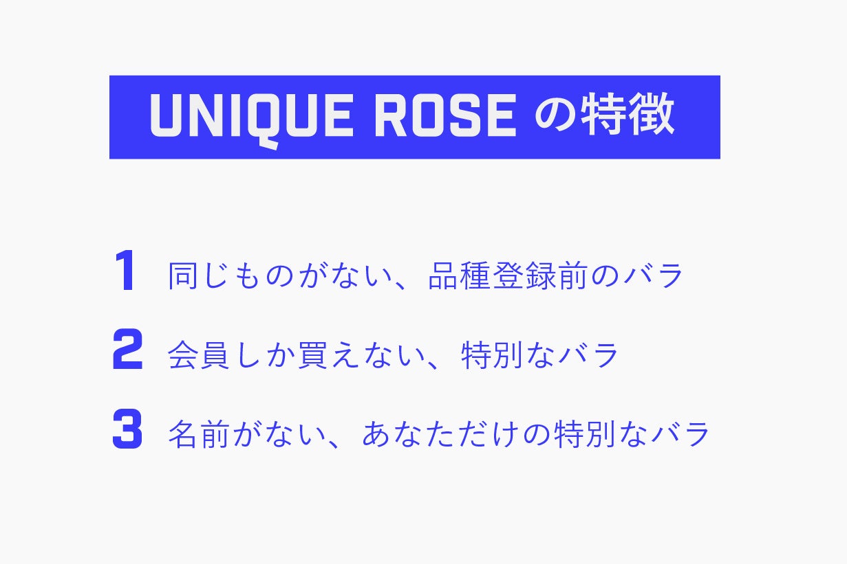 私たち人間が、DNAの違いや育つ環境の違いなどから、ひとりとして同じ人が存在しない尊い存在であるように、年間約1万種もの試験栽培の過程で生まれたバラたちも、ひとつとして同じものは存在しません。この「唯一無二である」という素晴らしさを込めて、UNIQUE ROSEと名付けました。