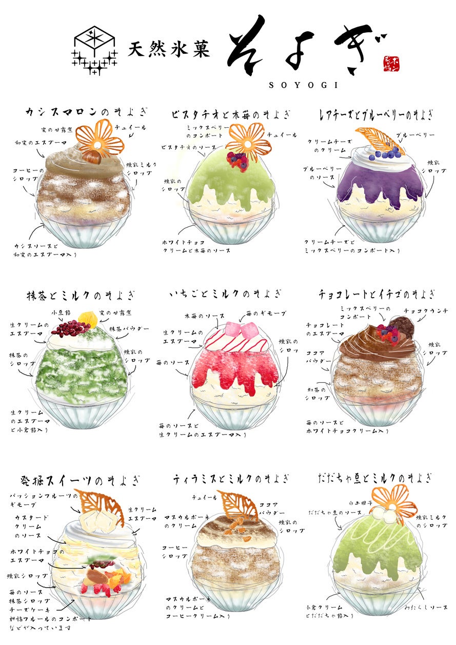 現在、山形県天童市に和洋菓子の店舗を展開している「菓子工房ボンむらやま」は、前身の和菓子専門店であった三代続いた「村山菓子店」を経て、洋菓子も販売することを機に「有限会社ボンむらやま」として昭和62年12月に設立されました。社名に選んだ「ボン」はフランス語のbonであり、良いとか素晴らしいという意味の他に「おいしい」という意味もあり選んだ言葉になります。そして多くの方に愛され続けている菓子店が、このたび泉町店を増改築して新たに作り上げるかき氷は、この「bon」という言葉を継承していきたいという思いを込め「ボン」から「梵(ボン)」に姿を変えます。この梵には「神聖な、清浄」といった意味があります。私にとってこれから扱う天然氷は、多くの人の手間暇がこもった尊い大切な存在であり、まさしく神聖で貴重な存在であります。桐の箱から出てきたようなこの氷を手にしたとき、天然氷=梵という思いで溢れました。当店で作るかき氷の名前にはすべて「そよぎ」という名前を付けております。梵の別の読み方である「そよぎ」は言い換えれば、「~味の神聖な氷」という思いの表れです。神聖なものには全力でぶつからなければいけません。パティシエとしての私の全力は、美味しいお菓子を作ることです。パティスリーならではの考え方で組み立てたソースを組み合わせ、まるでケーキのような仕上がりになっているのも、氷と向き合ったときに感じた思いを形にした結果です。思いを込めた全9種類に優越はつけられません。すべて税込1400円にて販売することにしました。オーナーパティシエとして自ら書き上げたかき氷のイラストには、そんなかき氷に込めた思いが込められています。