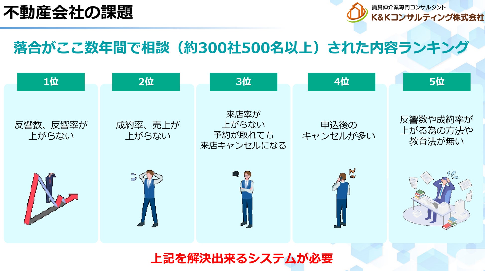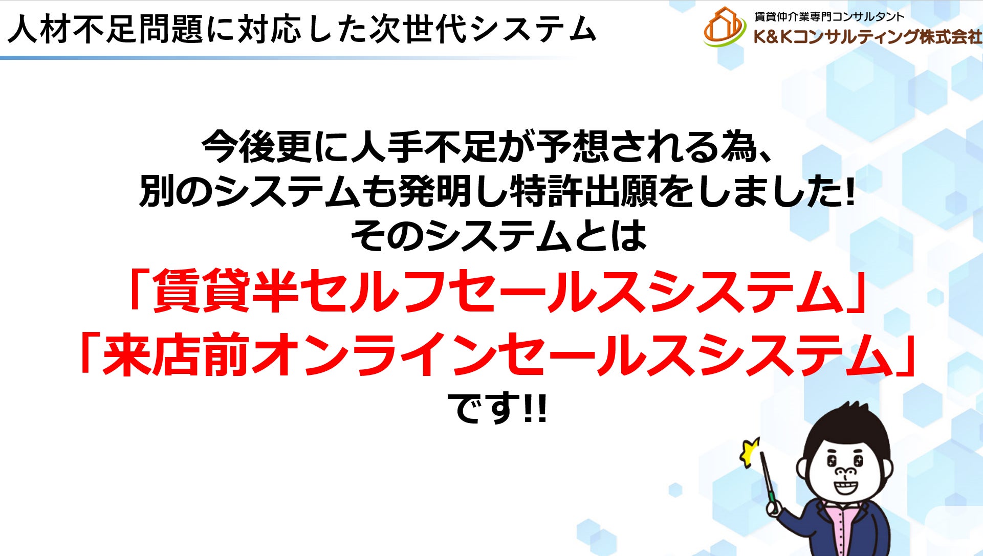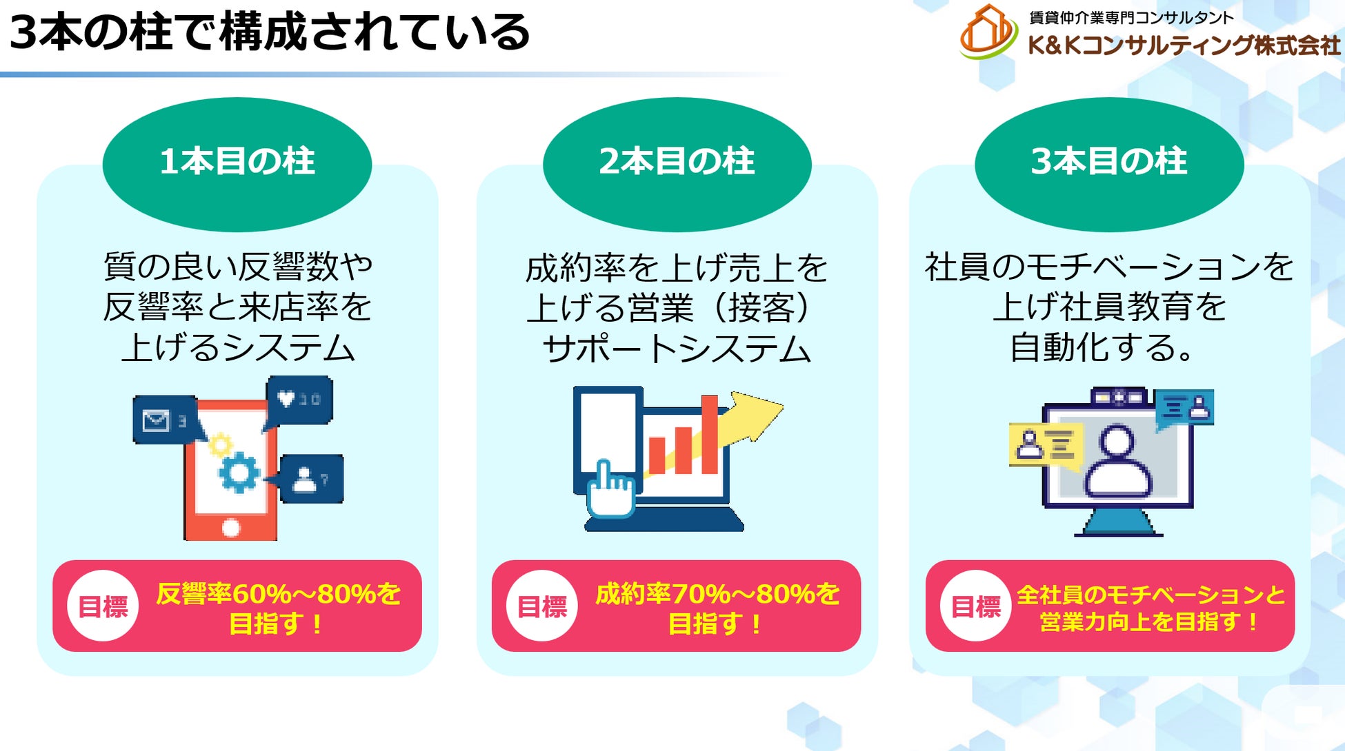 私は、この約10年間の数千組に及ぶ色々なタイプのお客様を接客した経験と300社以上の不動産業経営者の方々との面談経験、多岐にわたる営業からの相談とアドバイス、接客ロープレやさまざまな研修経験から、この賃貸業界で「私に何が出来るか」「皆様が何を必要としているか」を考え続けてきました。そして、この多くの経験から約2年間を掛けて発明したのがこの3つのシステムなのです。