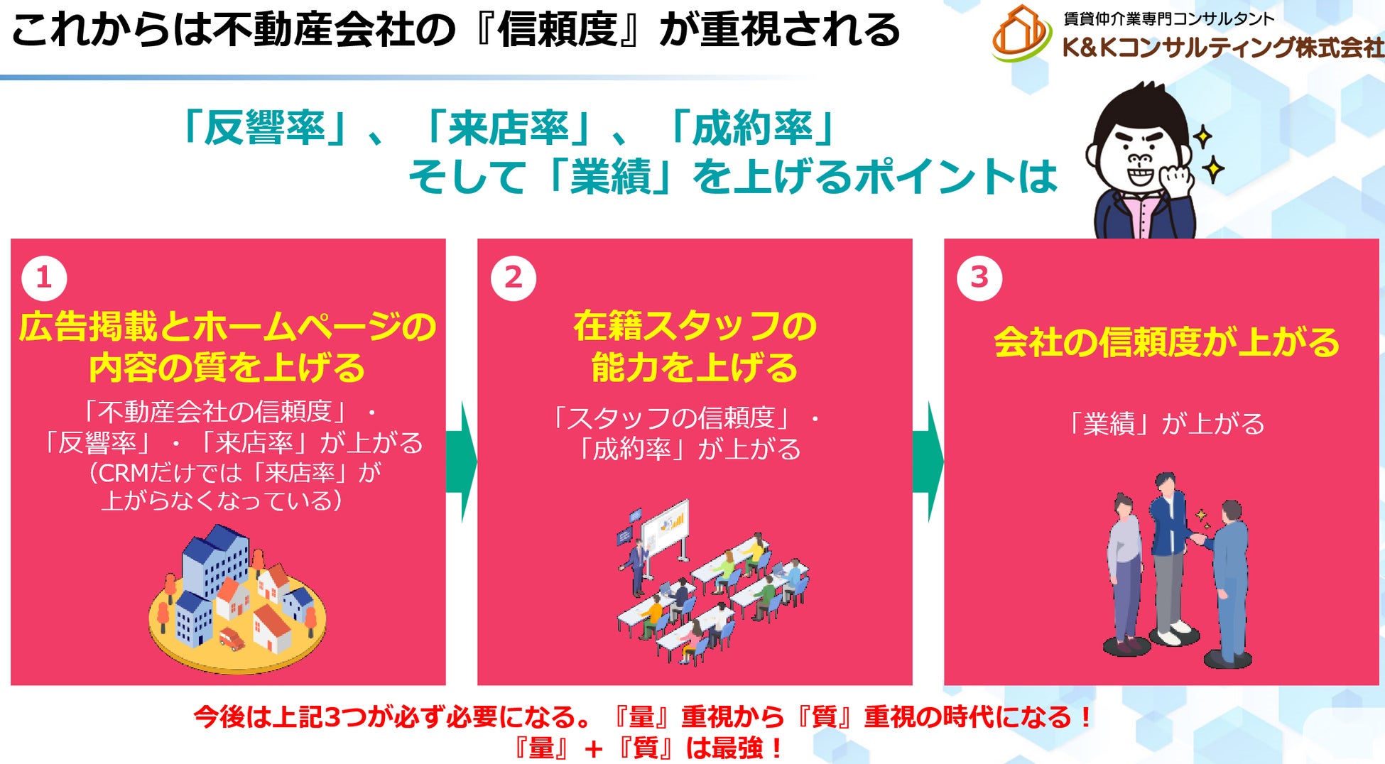 これからの不動産会社は「信頼度」を上げる必要があると考えてます。私が不動産会社を始めた時(約10年前)から「今ままでの集客と接客方法では若い世代の方々の心には届かない。また、スタッフもついて来れない」と考え、その事を重視した集客と接客戦略を考え実行した事により、高い「反響率」「成約率」になったのだと確信しております。お客様もスタッフもこれから更に「信頼度」による不動産会社選びが加速する事になるかと思ってます。