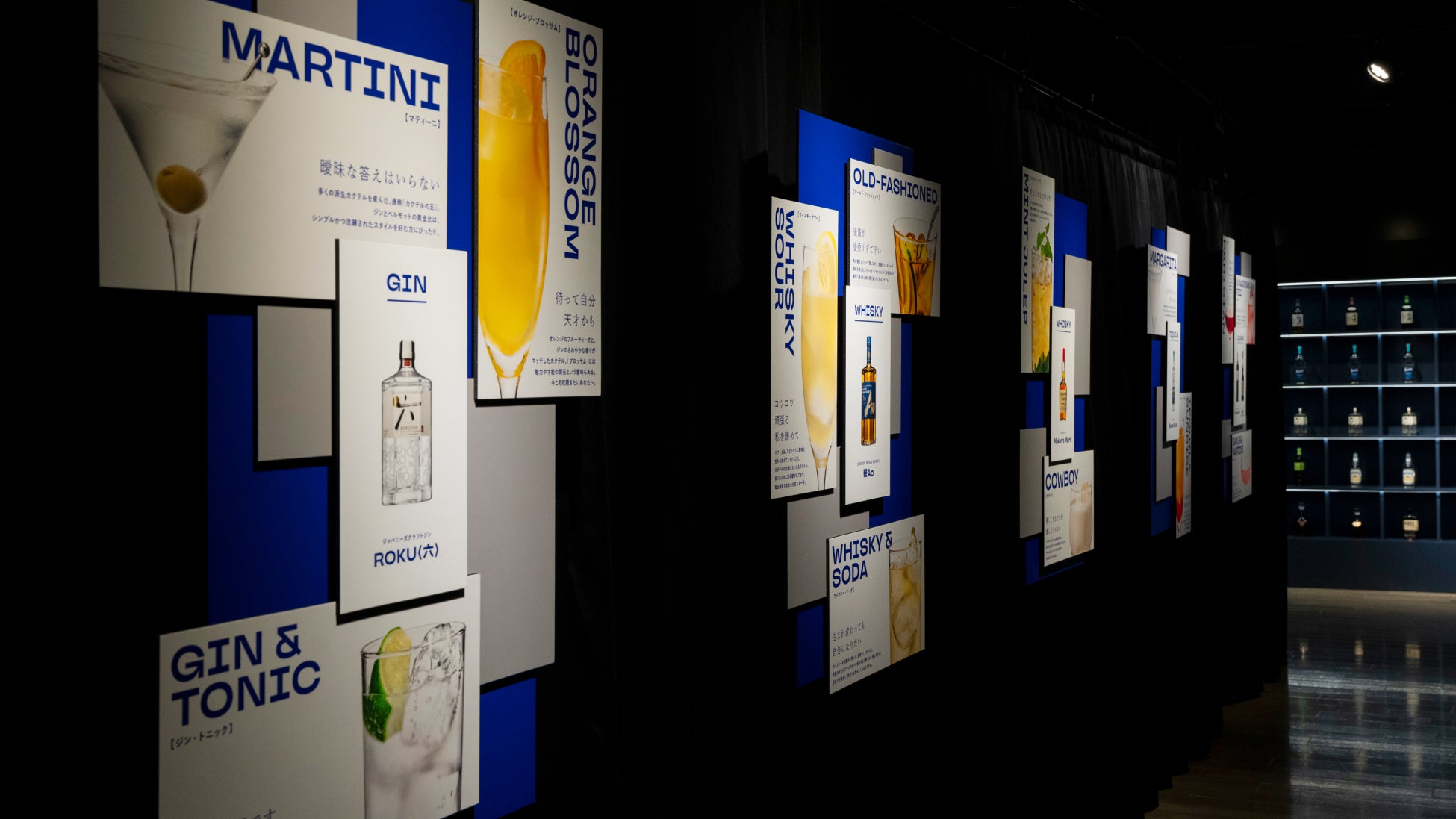 BAR空間の先にはカクテルの種類の豊富さを伝えるグラフィックの展示が待っています。楽しんだカクテルの余韻に浸りながら、選ばなかったグラスとコトバからつくられるカクテルについても知ることができます。また展示では、ひとつの製品が材料の組み合わせ次第で様々なカクテルへと変身を遂げることが一目でわかる、洗練された空間が続いています。