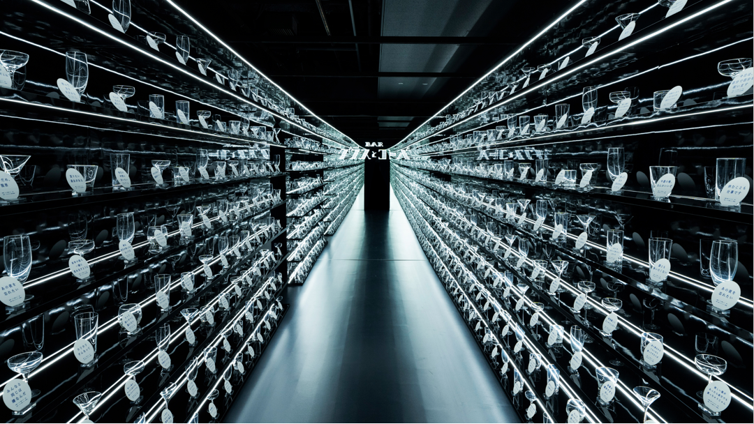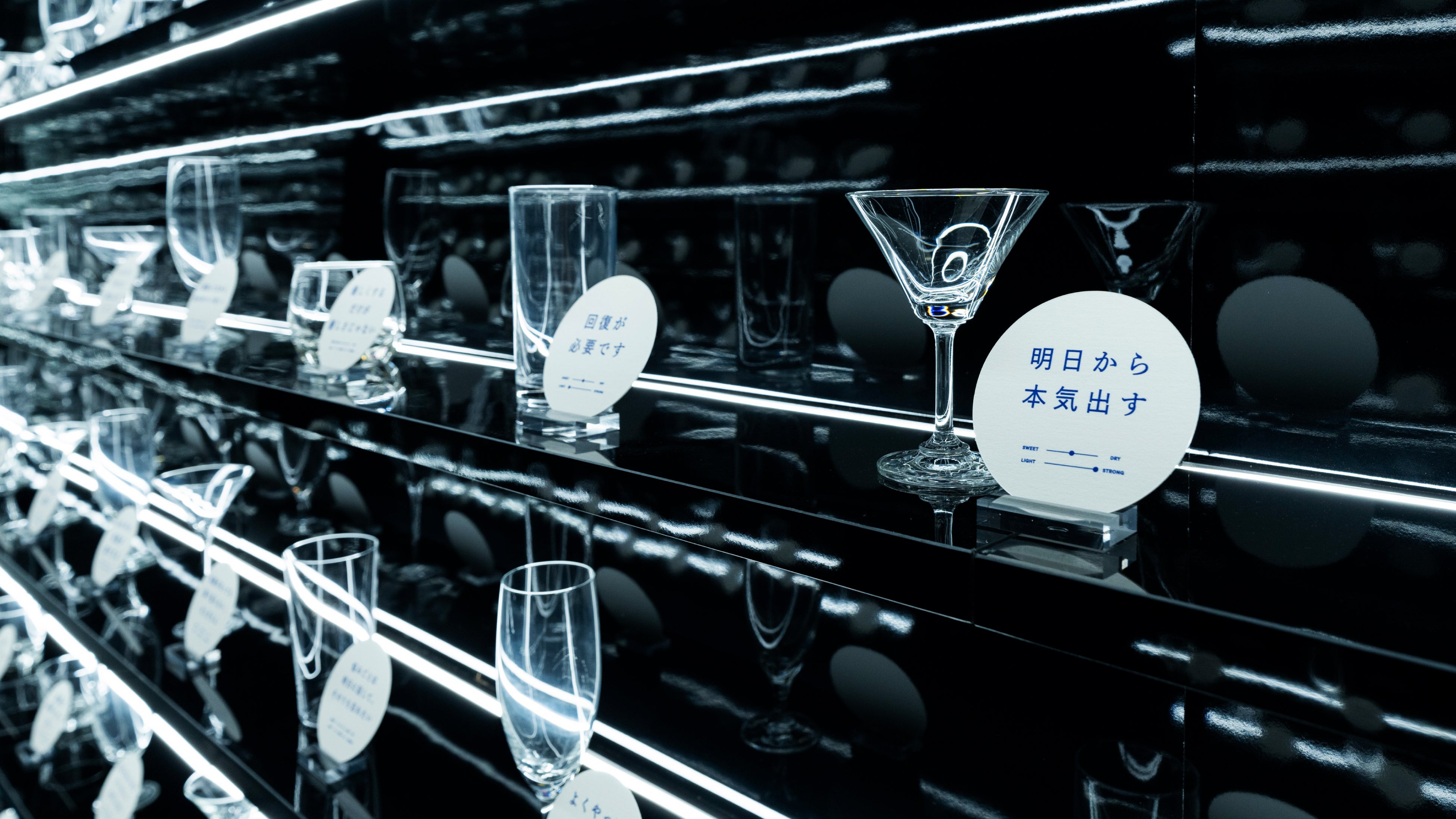 壁一面に多種多様なグラスが並ぶ圧巻の展示。黒を基調とした壁面に白い照明で照らされたグラスが、上品に煌めく幻想的な空間に広がります。その時の気分に合わせて数々のグラスとコトバが書かれたコースターの中からお気に入りのひとつを選ぶ、新感覚の体験を楽しむことができます。