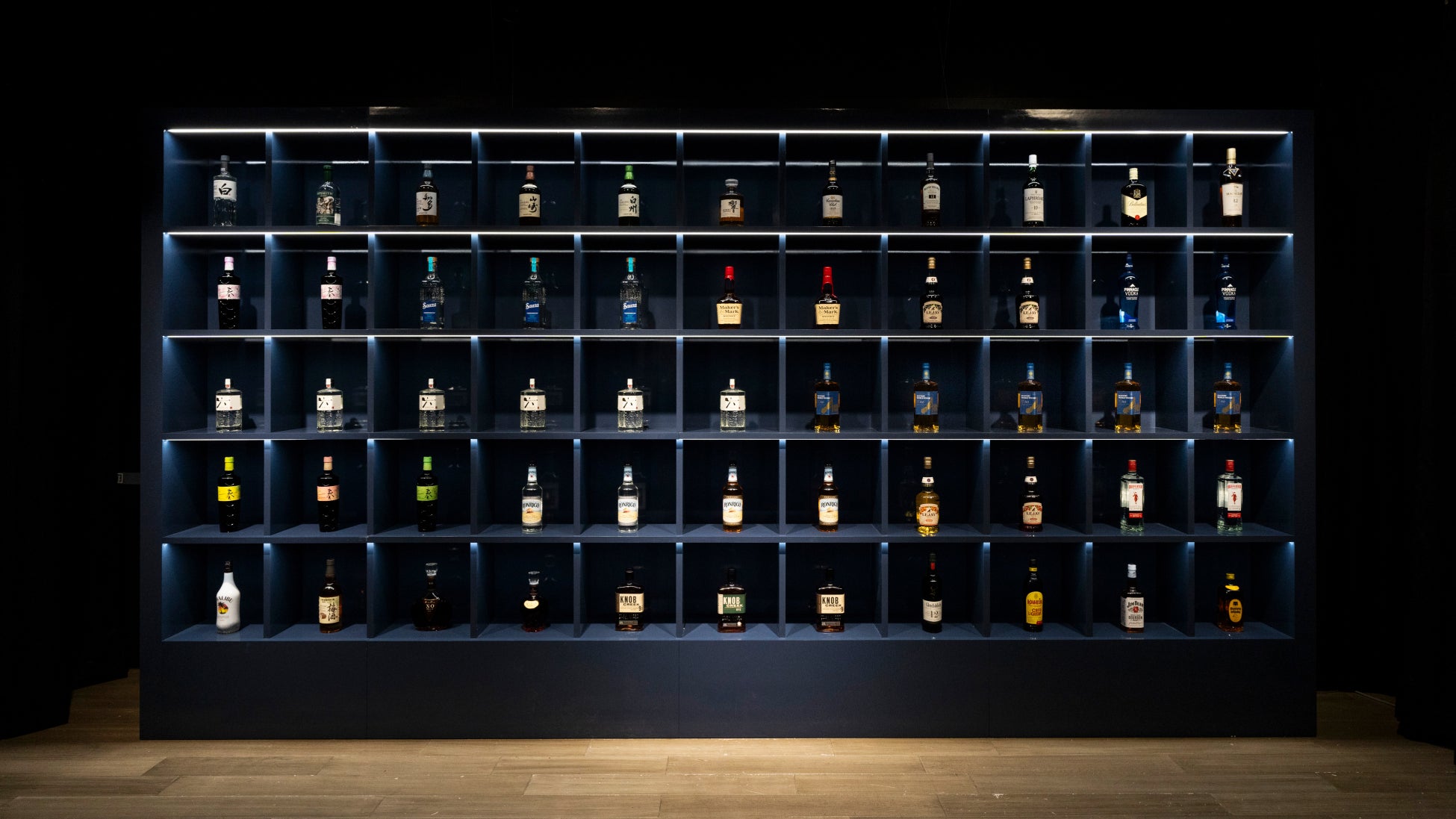 お酒の魅力のひとつでもあるボトルデザインの多彩さに触れることができる空間。照明でライトアップされ、壁一面に並ぶ55本ものボトルから、視覚的にもお酒の魅力について触れることができるフォトジェニックな展示になっています。