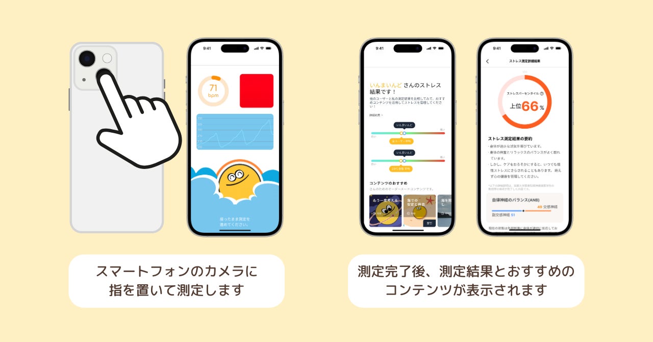 指先の血流の流れを測定し、自律神経のバランスを把握して数値化します。これにより、自身のストレスレベルを正確に知ることができます。スマートフォンのカメラに指を置き、1分ほど待つことでストレスレベルを測定することができます。