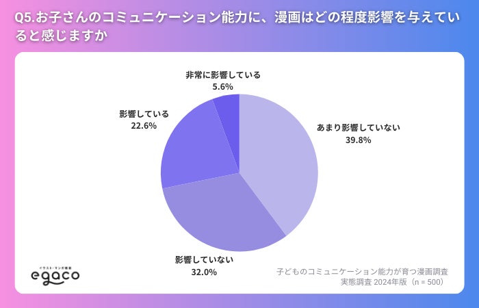 一方で、「影響している」と回答した方は22.6%、「非常に影響している」と答えた方は5.6%と、一定数の保護者が漫画の影響を肯定的に捉えていることも明らかになりました。特に、漫画が物語を通じて共感力や対話スキルを養う手助けをしていると感じる保護者も存在しています。