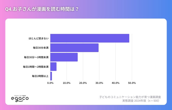 一方で、「毎日1時間〜2時間未満」の回答は3.8%、「毎日2時間以上」の回答はわずか1%と少数派でした。これらの回答から、長時間にわたって漫画を読むお子さんは少数であり、多くの家庭で読書時間が一定の枠内に収まっていることがわかります。これには、学業や他の活動とのバランスを保つための意識が影響している可能性があります。