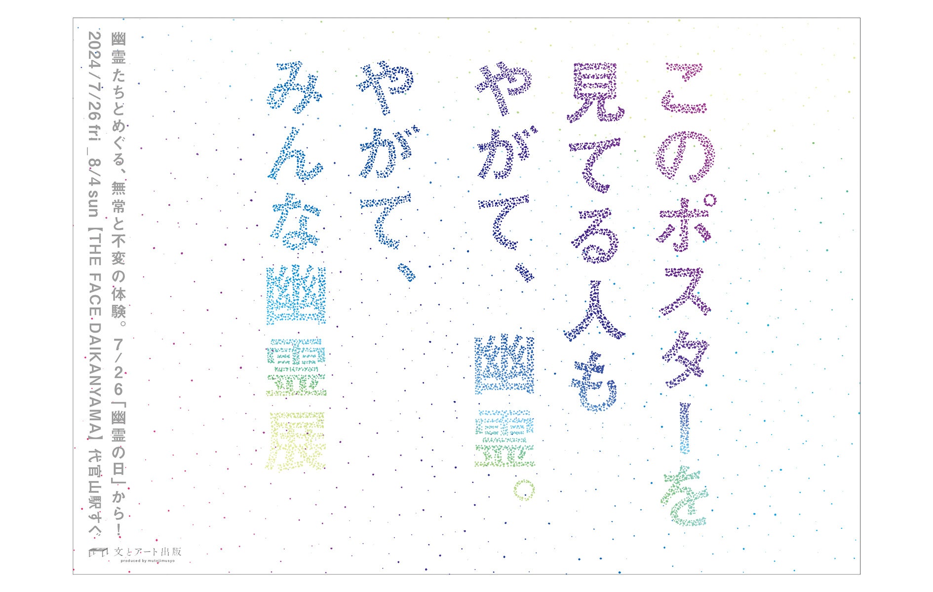 コピーライター、クリエイティブディレクターである武藤雄一を中心に2024年に設立した「文とアート出版」は、第一回出版作品であるアートブック「やがて、みんな幽霊」を7月26日(金)より出版します。そしてこの度アートブック「やがて、みんな幽霊」の出版記念としてリアル体験ができる『やがて、みんな幽霊展 ~怖くない幽霊屋敷~』(以下、『やがて、みんな幽霊展』)を“幽霊の日(※1)”である7月26日(金)を皮切りに8月4日(日)まで東京・代官山の「THE FACE DAIKANYAMA」にて入場無料で開催します。