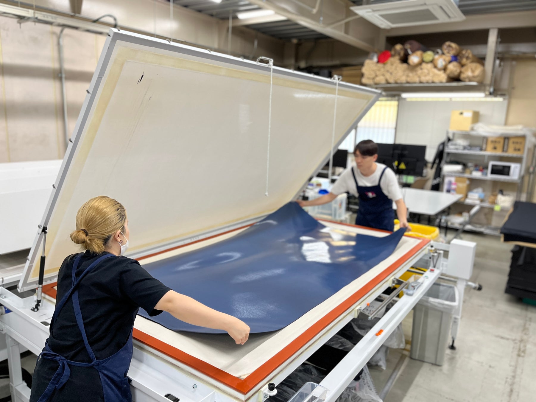 水性ラミネート加工は、この臭気がほとんどなく無臭に近い為、過度な換気が必要なく徹底した湿度・温度管理が可能となった。結果として従業員にも環境にも素材にも優しい加工方法となっている。