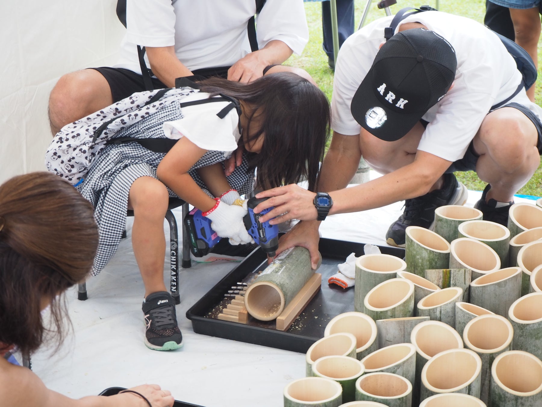 イベントにあわせて、小学生を対象に「子ども竹あかりワークショップ」も開催。ドリルを使って竹に穴をあけ「竹あかり」を制作します。