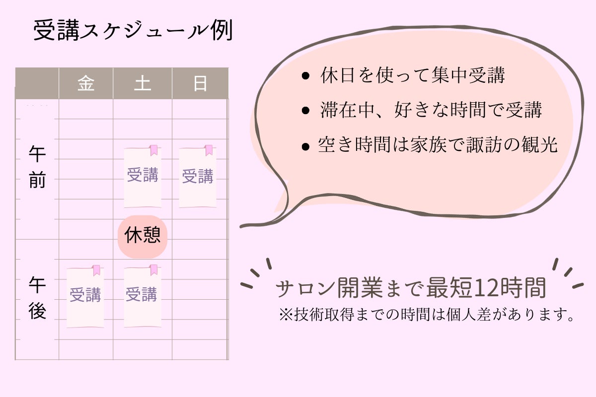 短期集中型の効率的な学習環境:宿泊をすることで、集中してネイルサロン経営に必要最低限のスキルを取得する。