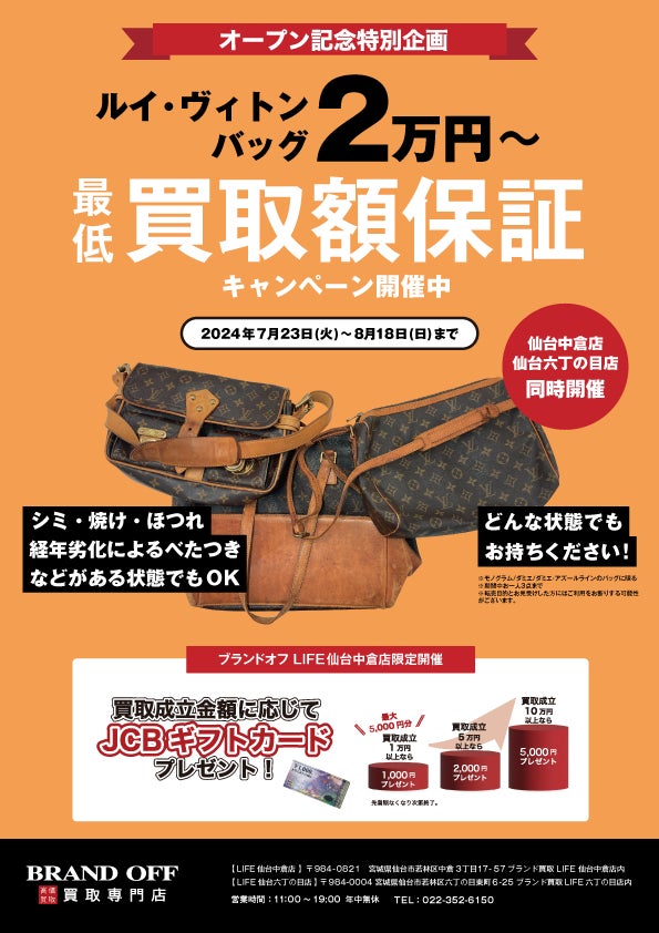 株式会社TGM(宮城県仙台市若林区中倉3丁目17-57、代表取締役社長:田上悠喜)のブランド買取専門店LIFEは2024年7月23日(火)に「BRAND OFF LIFE仙台中倉店」をオープンいたします!