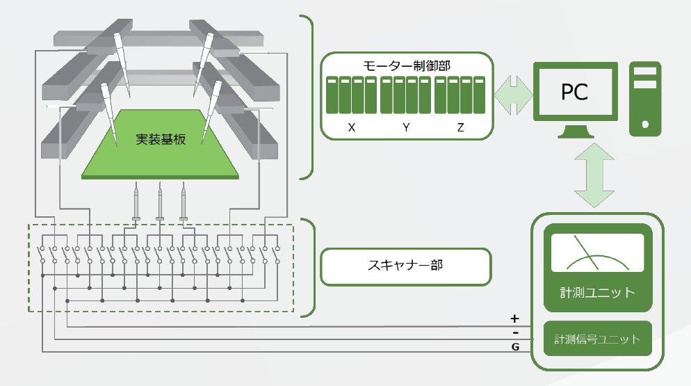 フライングプローブテスタは、複数のプローブが基板上の任意のポイントに移動しながらインサーキット検査(ICT)を行う装置です。特別な治具が不要で、検査プログラムの入れ替えだけで段取り替えが可能なため、多品種・少量生産基板のアナログ回路・電源回路の検査に適しています。